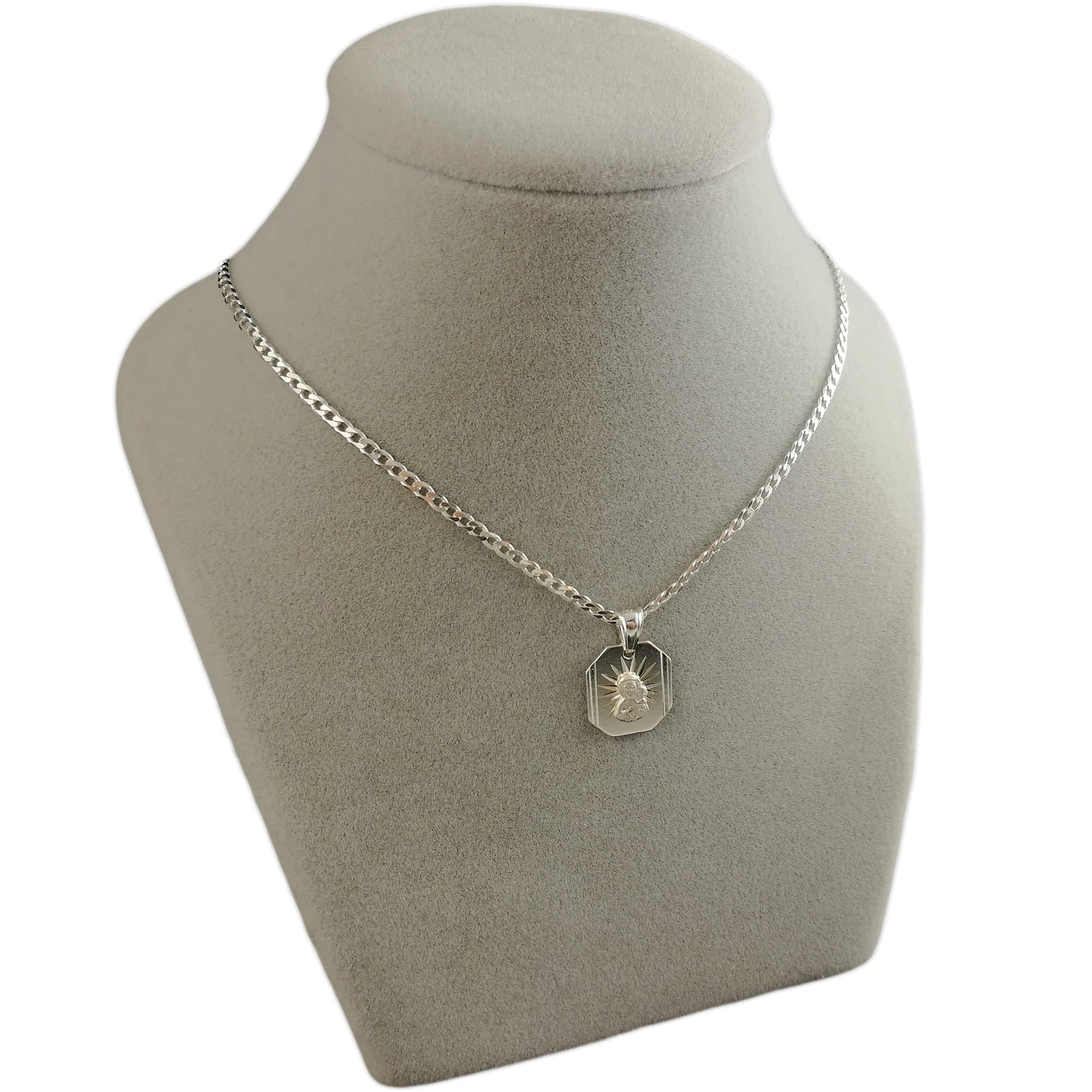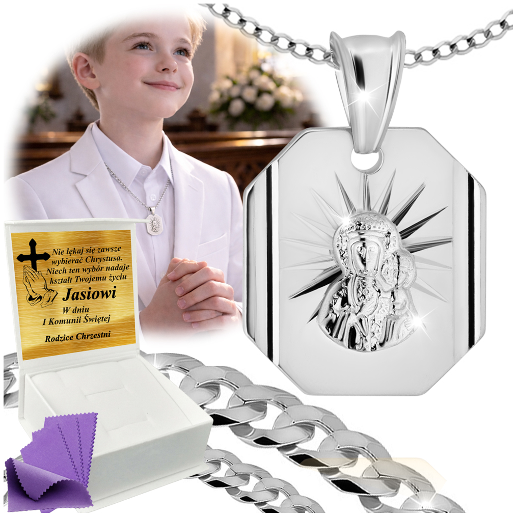 Stylowy i elegancki srebrny naszyjnik z medalikiem przedstawiającym wizerunek Matki Boskiej. Wykonany z najwyższej jakości srebra próby 925, łączy w sobie klasyczną formę z duchowym znaczeniem. Medalik ma ośmiokątny kształt z delikatnie fazowanymi brzegami, co nadaje mu subtelnego charakteru. Wizerunek Matki Boskiej otoczony promienistą aureolą symbolizuje opiekę i błogosławieństwo.