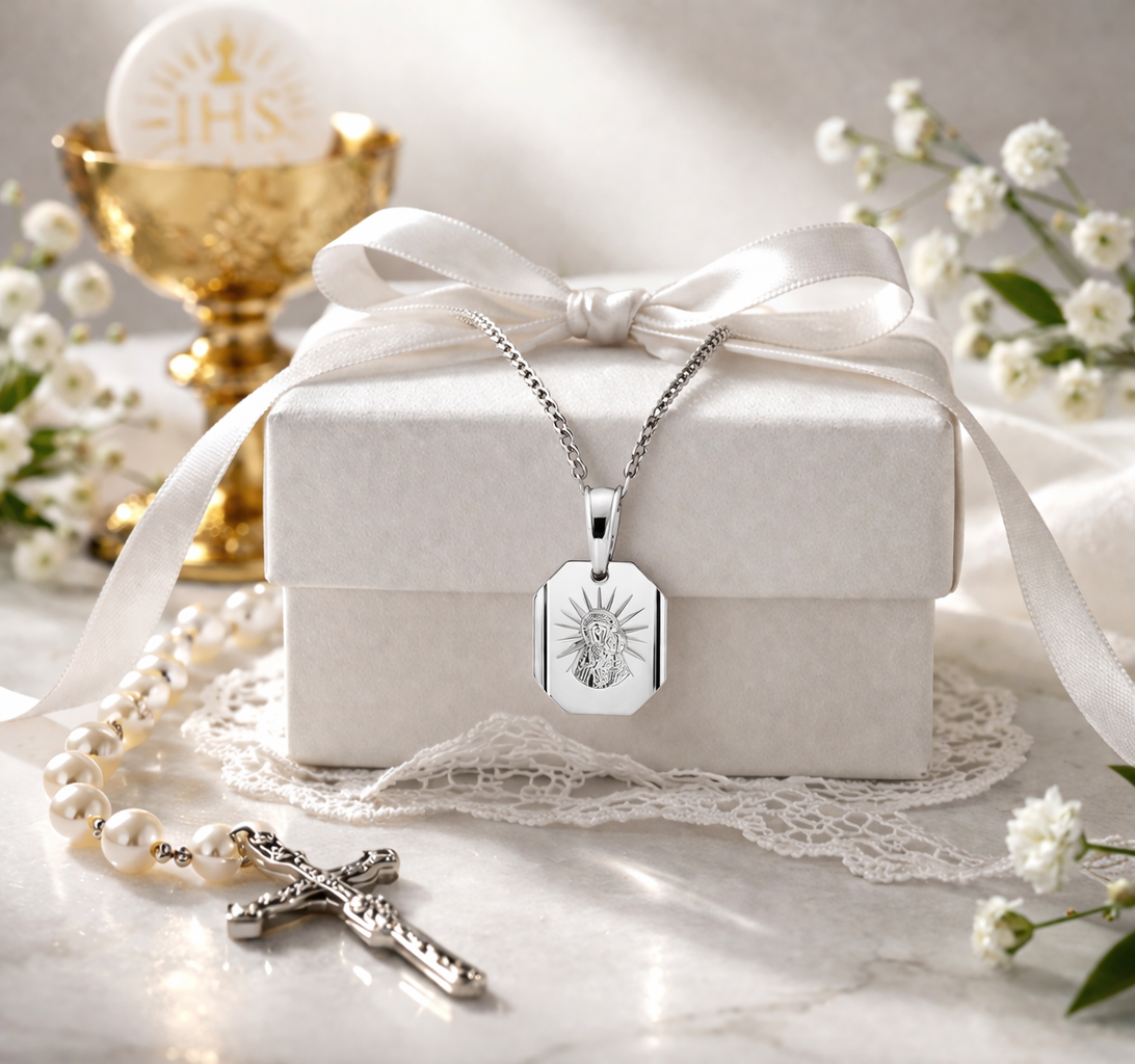 ➡️ Możesz wybrać w jakie pudełko zapakować produkt. Dostępne jest : standardowe brązowe z logiem firmy oraz okazjonalne do Komunii Św. lub Chrztu Św. w kolorze białym.