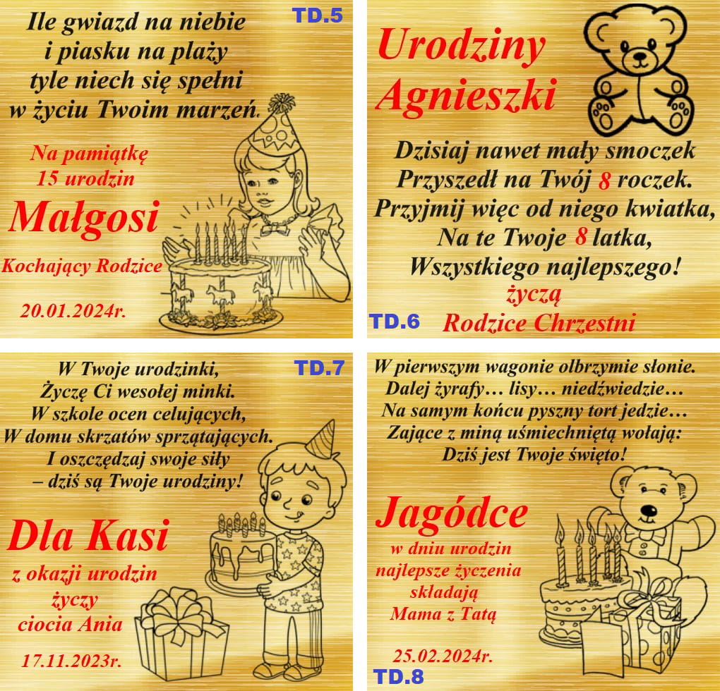 ➡️ Podaj, który numer projektu tabliczki wybierasz oraz dane do wpisania w miejsca oznaczone na czerwono.  Aby otrzymać tabliczkę prosimy o następującą wiadomość informacje np: