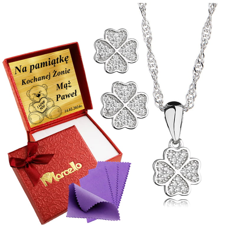 Srebrny Komplet Koniczynki Naszyjnik Kolczyki