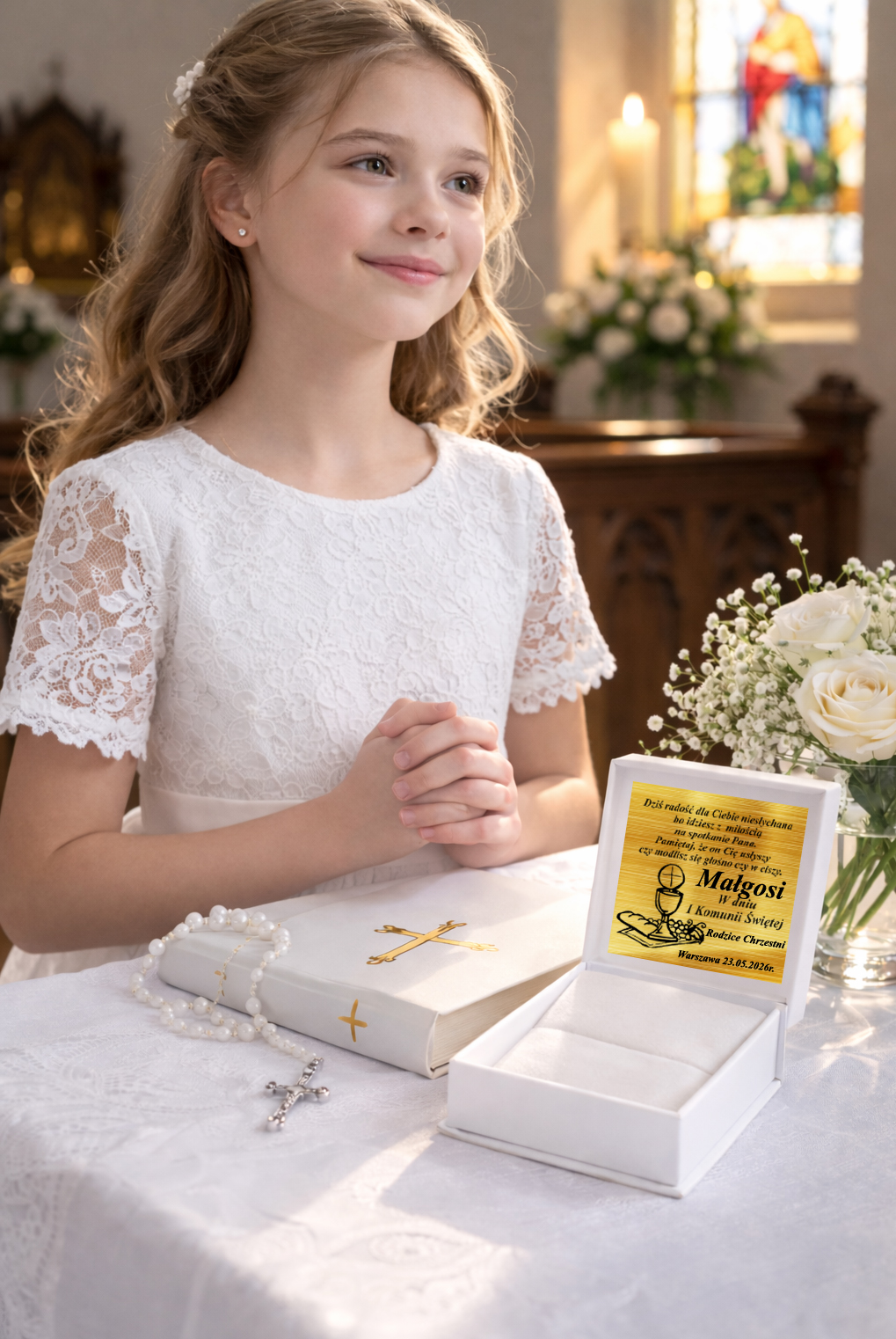 ➡️ Możesz wybrać w jakie pudełko zapakować produkt. Dostępne jest : standardowe brązowe z logiem firmy oraz okazjonalne do Komunii Św. lub Chrztu Św. w kolorze białym.