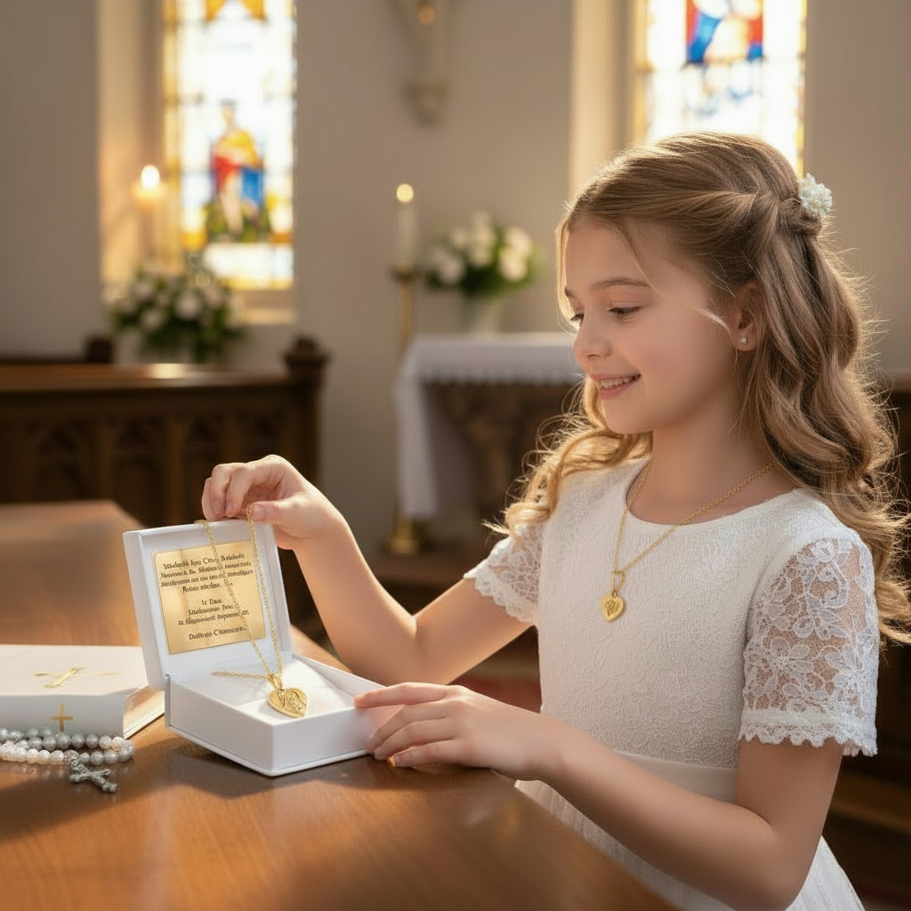 ➡️ Możesz wybrać w jakie pudełko zapakować produkt. Dostępne jest : standardowe brązowe z logiem firmy oraz okazjonalne do Komunii Św. lub Chrztu Św. w kolorze białym.