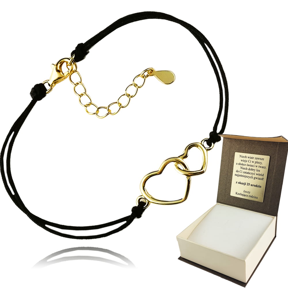 Złota Bransoletka Serduszka na sznurku z regulowaną długością w całości wykonana ze srebra pozłacanego 24k złotem