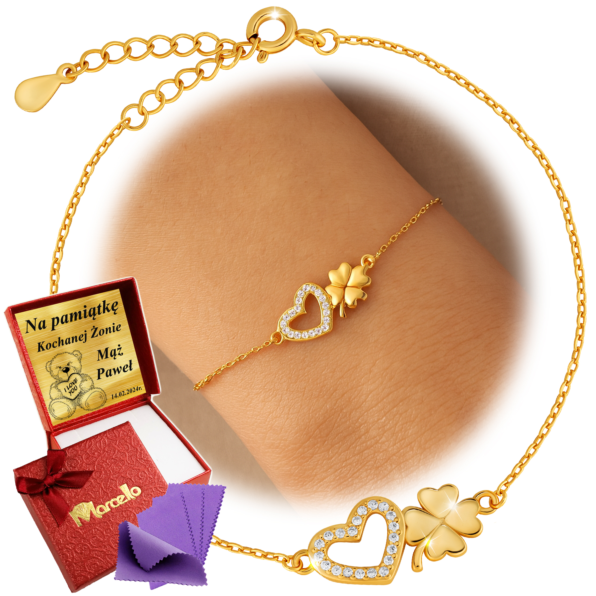 Złota Bransoletka Serce z Koniczynką z Cyrkoniami Srebro 925 Grawer PREZENT