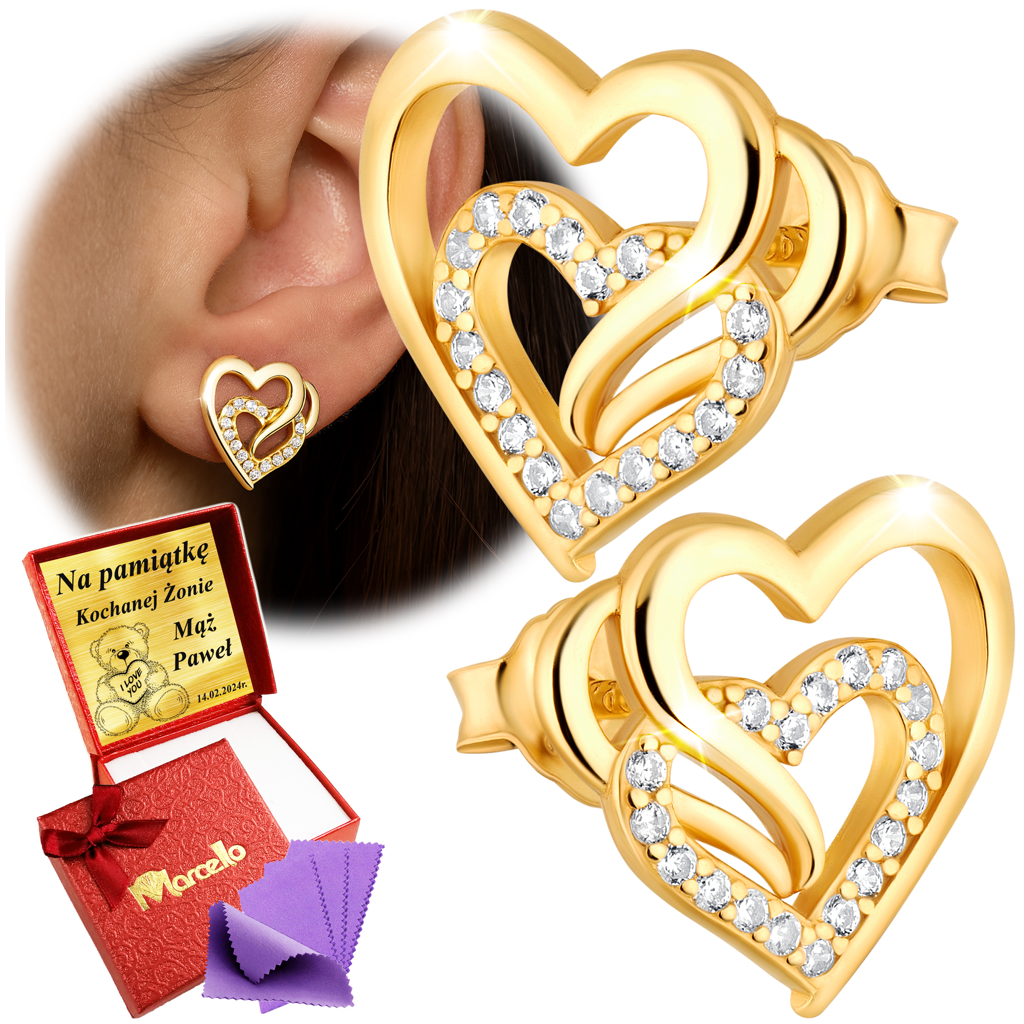 Złote Kolczyki Damskie Serduszka Cyrkonie Dla Kobiety 925 Na Prezent Grawer