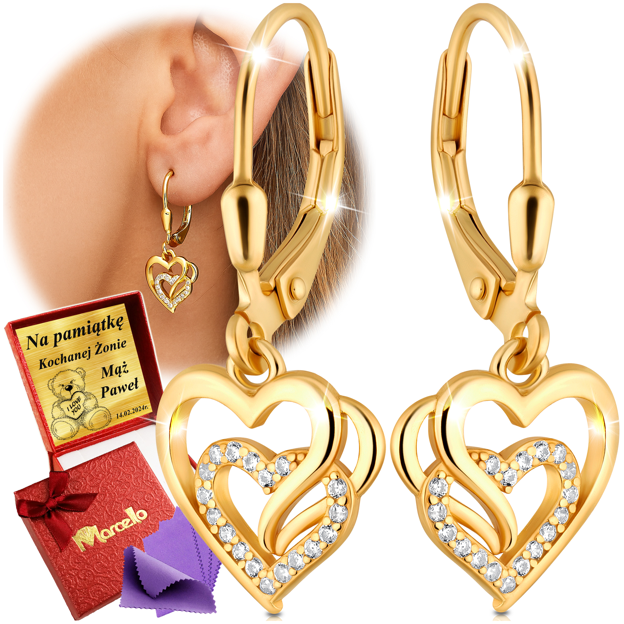 Złote Kolczyki Serduszka Wiszące Srebro 925 Dla Kobiety Na Prezent Grawer
