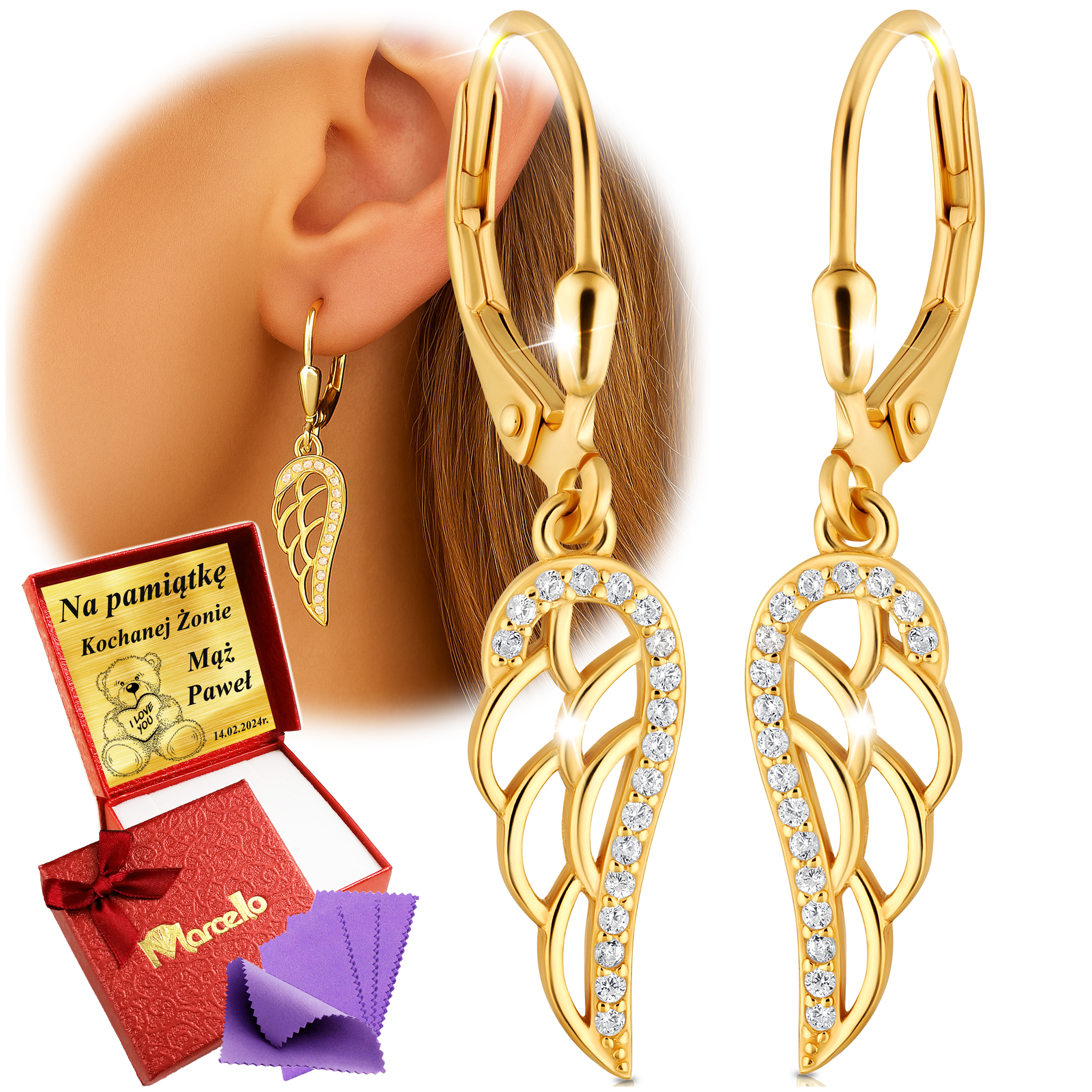 Złote Kolczyki Wiszące Skrzydła Anioła 925 Na Prezent Dla Kobiety Grawer