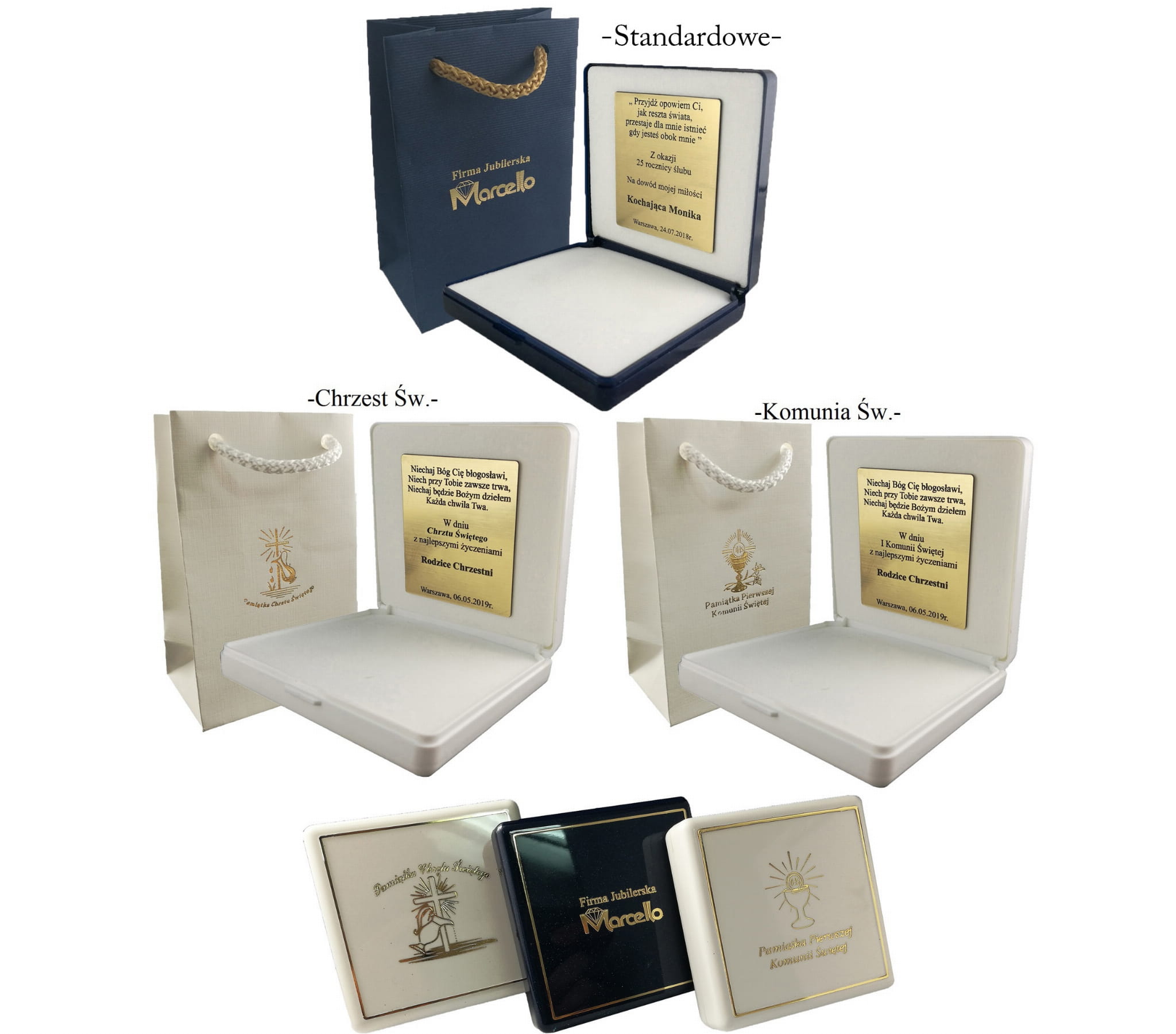 ➡️ Możesz wybrać w jakie pudełko zapakować produkt. Dostępne jest : standardowe brązowe z logiem firmy oraz okazjonalne do Komunii Św. lub Chrztu Św. w kolorze białym.