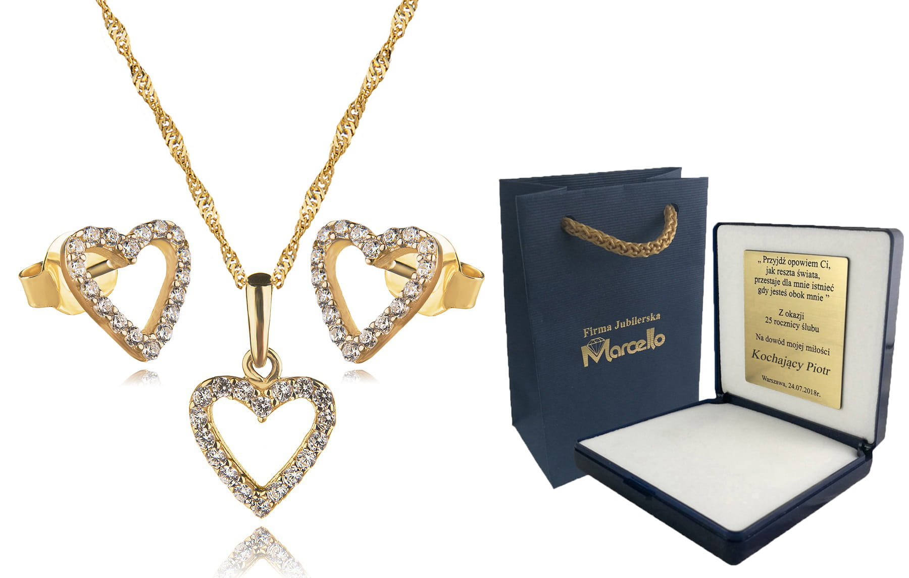 ZŁOTY KOMPLET NASZYJNIK KOLCZYKI SERCA 333+GRAWER