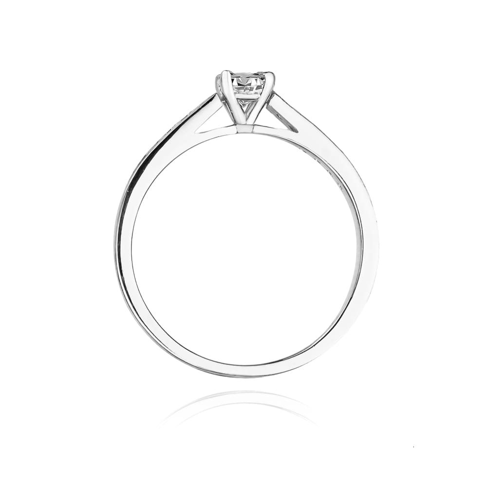 Pierścionek prezentuje się stylowo i efektownie a dzięki precyzyjnej jakości szlifu brylantów maksymalnie wydobyte zostały z nich walory optyczne dzięki czemu brylant wspaniale się mieni.