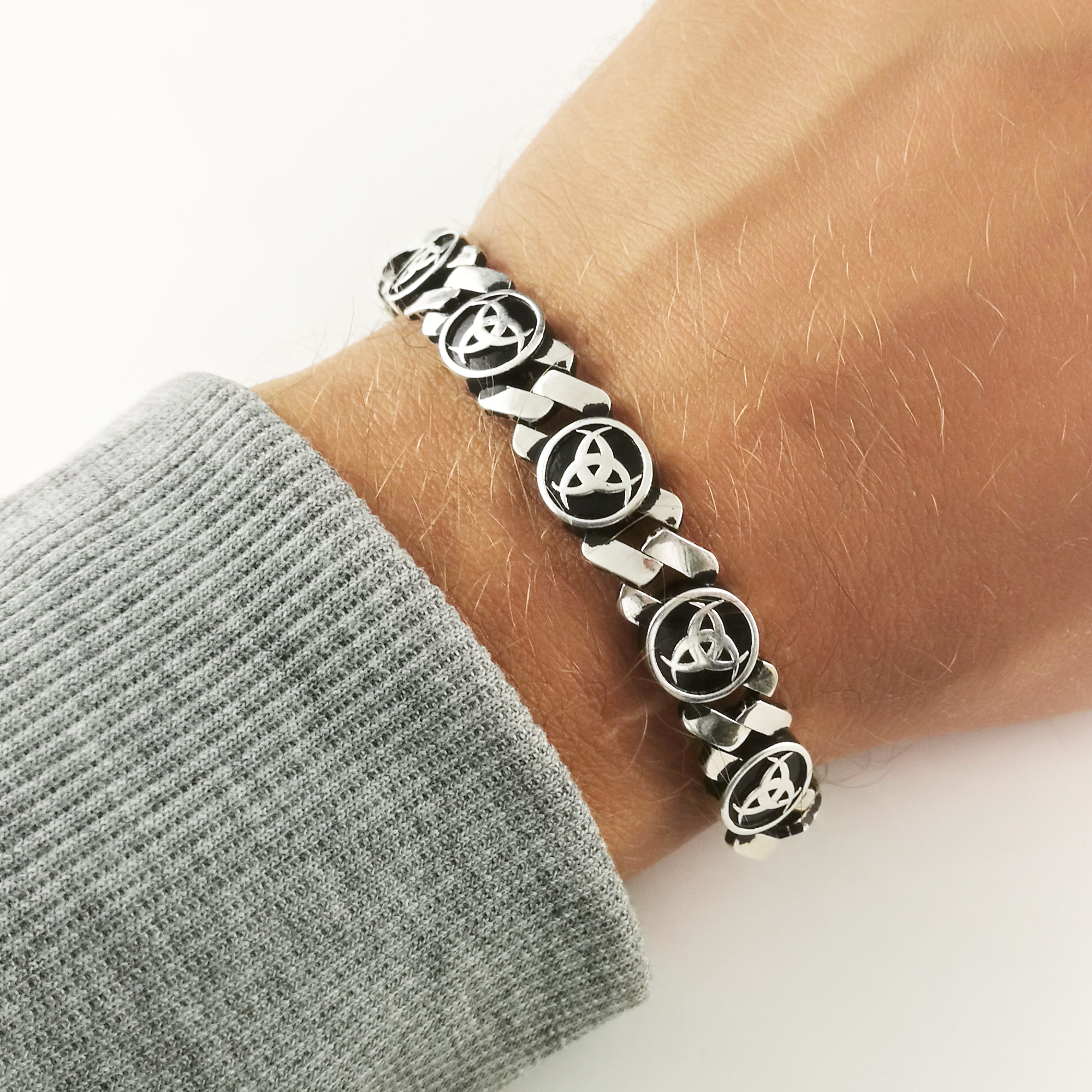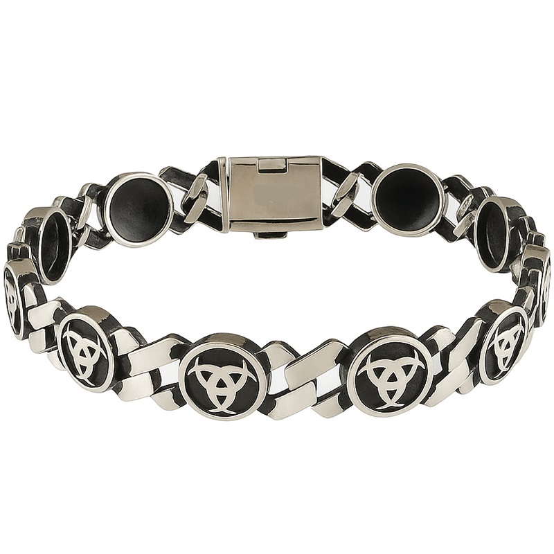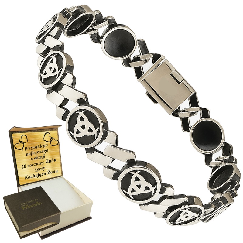 Stylowa i wyrazista męska bransoleta wykonana ze srebra próby 875. Jej charakterystyczny design opiera się na solidnych ogniwach ozdobionych okrągłymi elementami z geometrycznym motywem, nadającym całości unikalny i niepowtarzalny charakter. Połączenie srebra z oksydowanym wykończeniem podkreśla męski, nieco surowy styl biżuterii.
