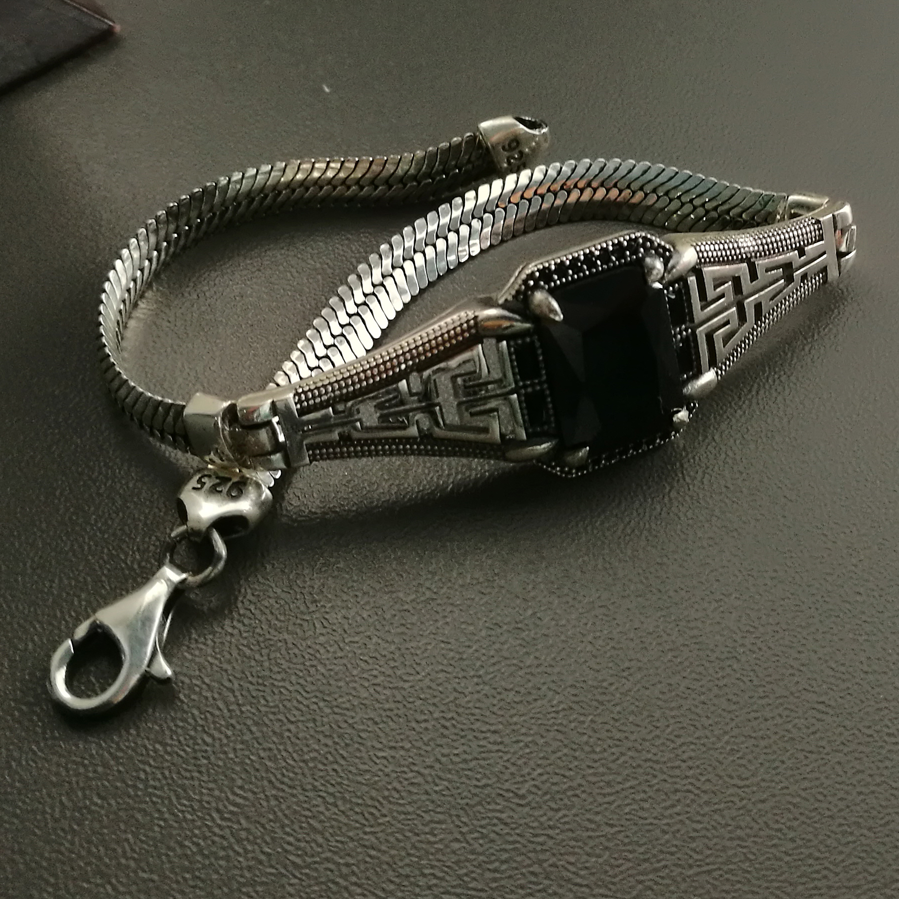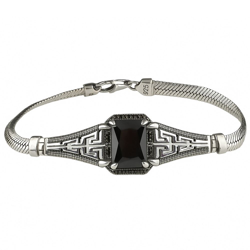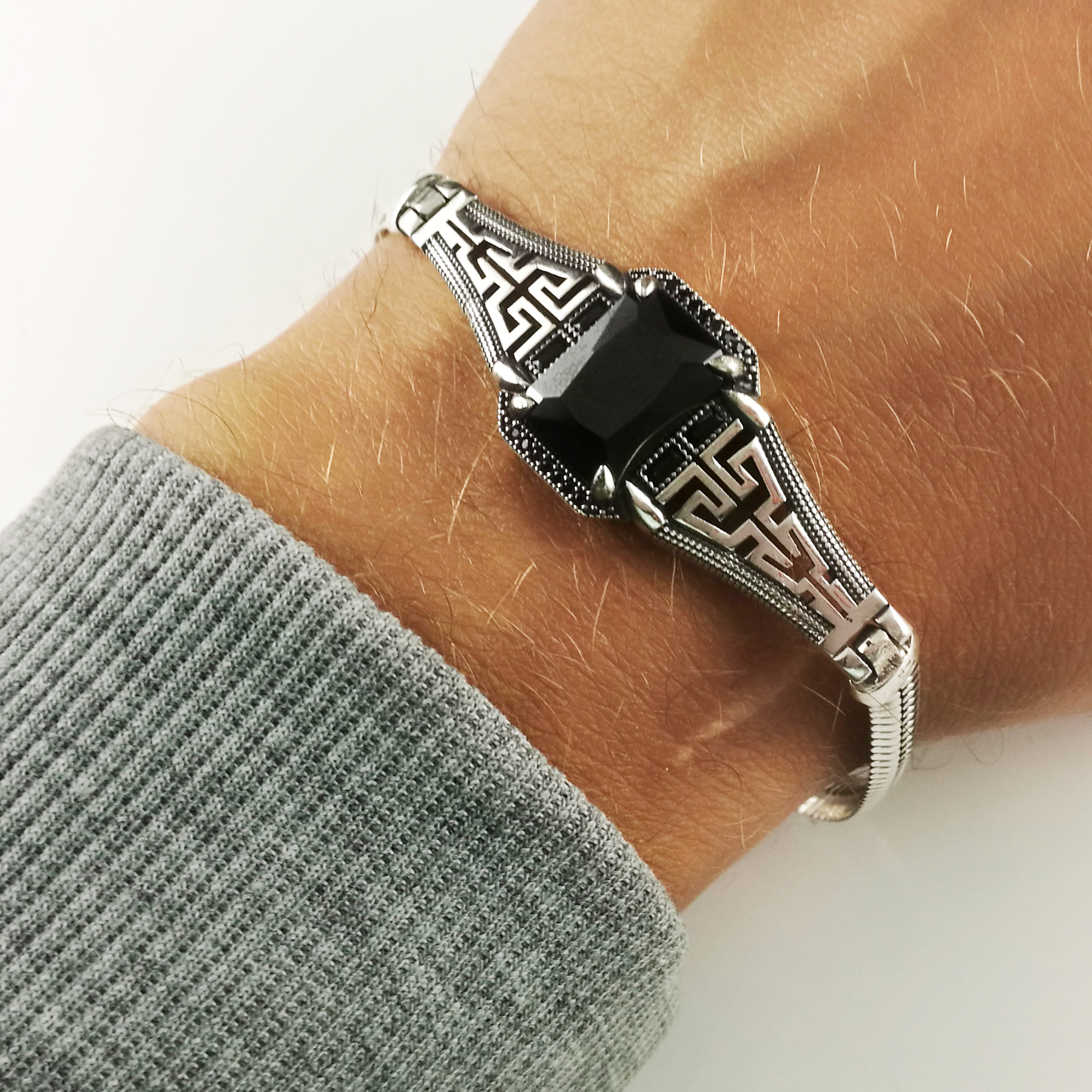 Centralnym elementem bransolety jest czarny kamień o szlifie prostokątnym, osadzony w geometrycznej, zdobionej oprawie. Detale w stylu etniczno–geometrycznym podkreślają męski charakter biżuterii, nadając jej niepowtarzalny i elegancki wygląd.