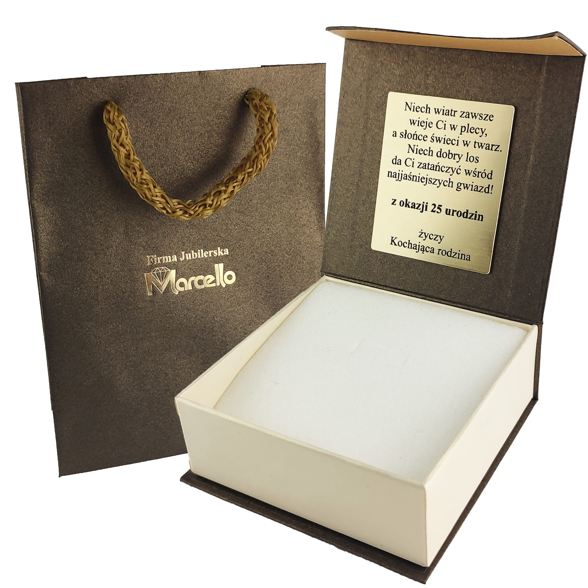 Spraw ,aby Twój prezent był naprawdę wyjątkowy. Specjalnie dla Ciebie wykonamy GRATIS dowolną DEDYKACJĘ i umieścimy ją w wybranym przez Ciebie pudełeczku wraz z biżuterią (Standardowym granatowym lub białym do Chrztu lub Komunii) . Do kompletu otrzymasz specjalną torebeczkę prezentową.Całość z pewnością nada elegancji i oryginalności Twojemu podarunkowi. GRAWER wykonujemy nowoczesną techniką laserową na specjalnie przygotowanej do tego tabliczce. Litery są wypalane laserem ,więc nie ma obaw ,że z czasem ulegną wyblaknięciu.
