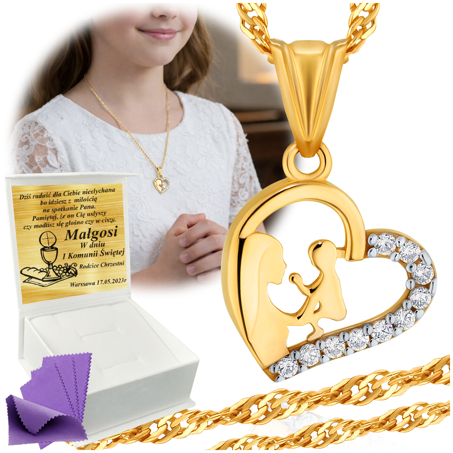 Przedmiotem sprzedaży jest złoty naszyjnik łańcuszek z medalikiem. Produkt jest nowy, zapakowany w eleganckie pudełeczko. Wyrób został precyzyjnie wykonany z należytą dbałością o detale.Łańcuszek posiada bezpieczne  zapięcie chroniące przed zgubieniem.Wszystko zostało wykonane ze złota próby 14 karatowej 585.Wszystkie złote wyroby oferowane w naszej sprzedaży posiadają nabitą próbę bądź znak imienny producenta potwierdzający autentyczność metalu szlachetnego. Każdy złoty produkt o masie powyżej 1 gram jest przebadany w Państwowym Urzędzie Probierczym pod kątem jakości złota i ma wybitą próbę zgodnie z Polskim prawem probierczym więc wybierając naszą ofertę masz 100% pewności że kupujesz wyrób oryginalny i faktycznie w całości wykonany ze złota.