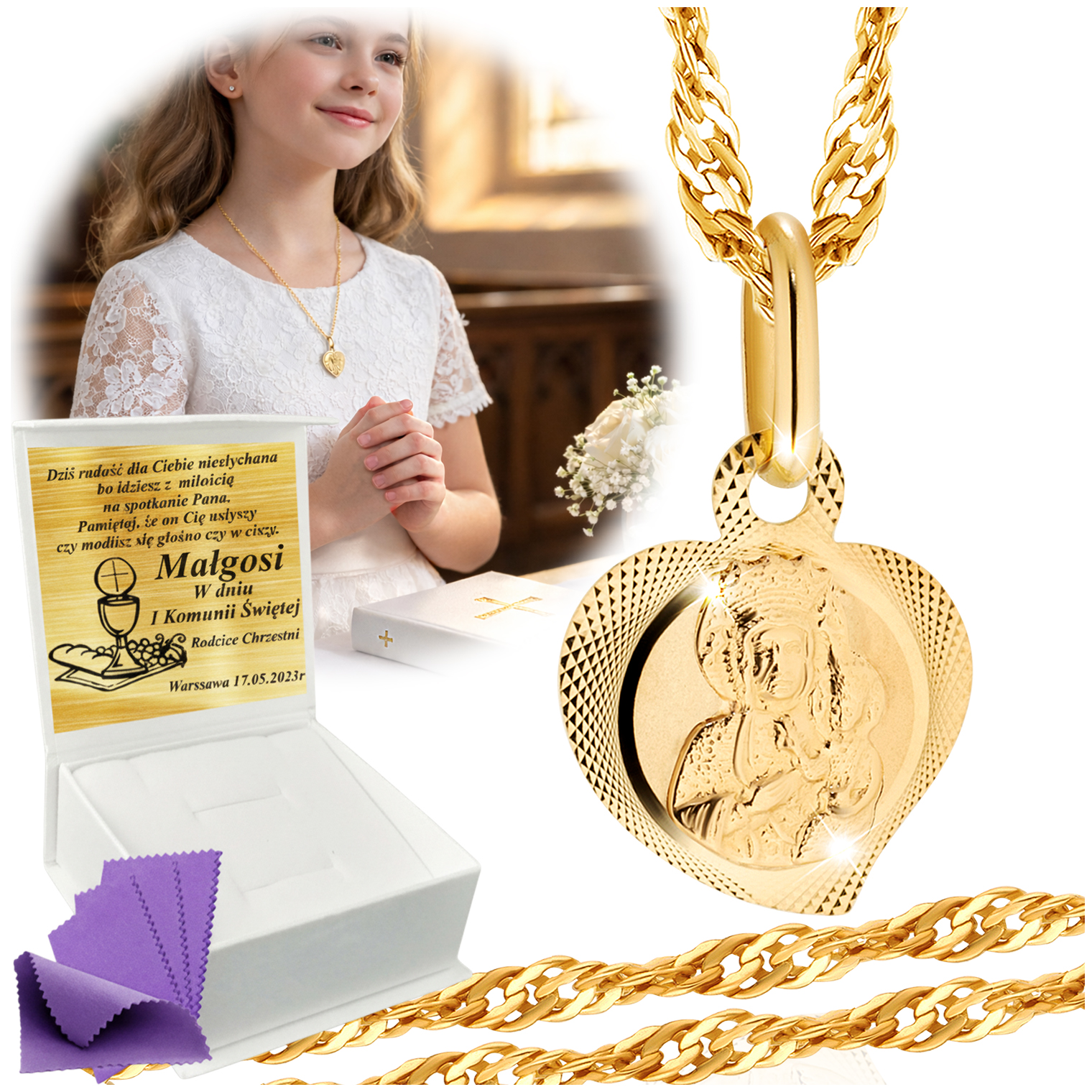 ➡️ Możesz wybrać w jakie pudełko zapakować produkt. Dostępne jest : standardowe brązowe z logiem firmy oraz okazjonalne do Komunii Św. lub Chrztu Św. w kolorze białym.
