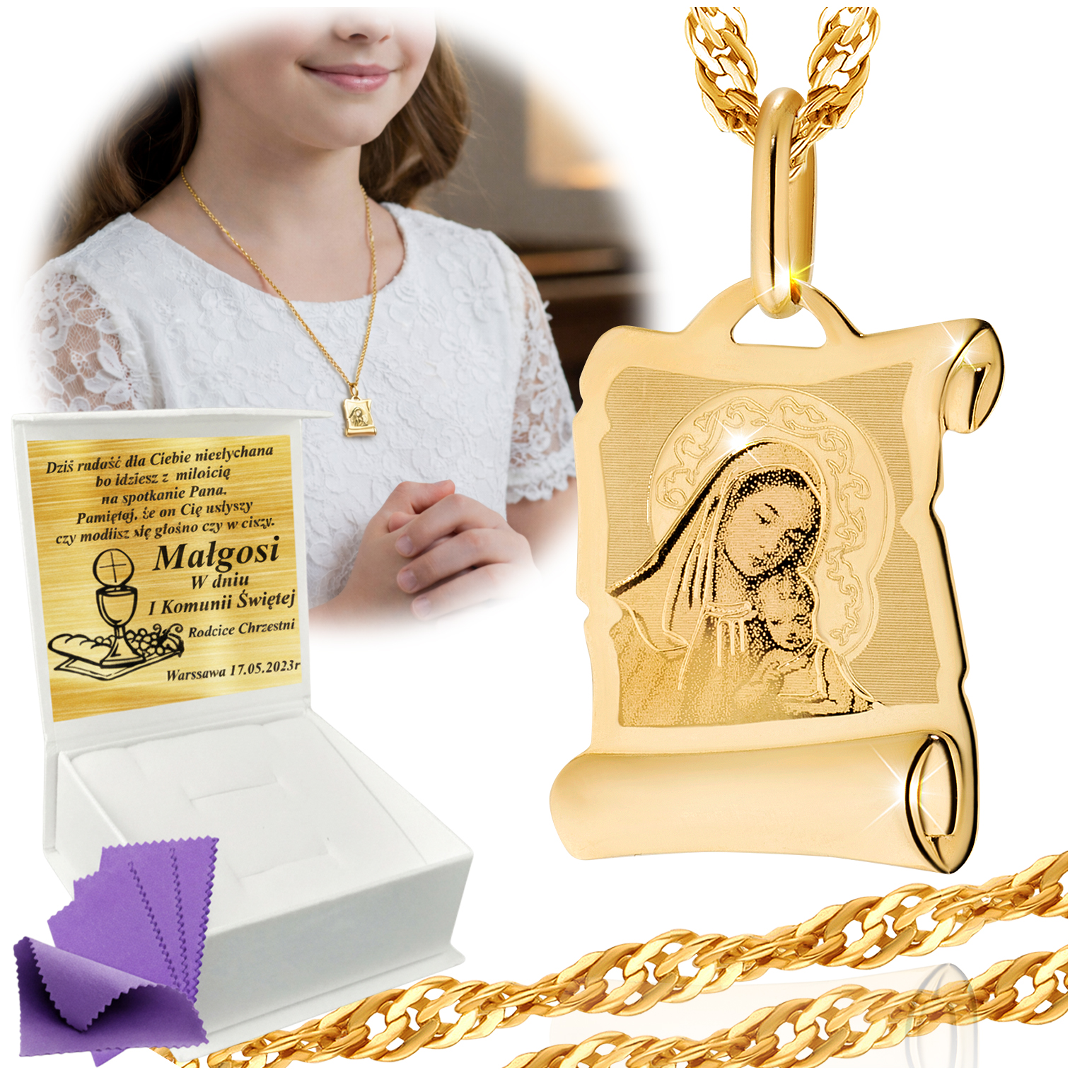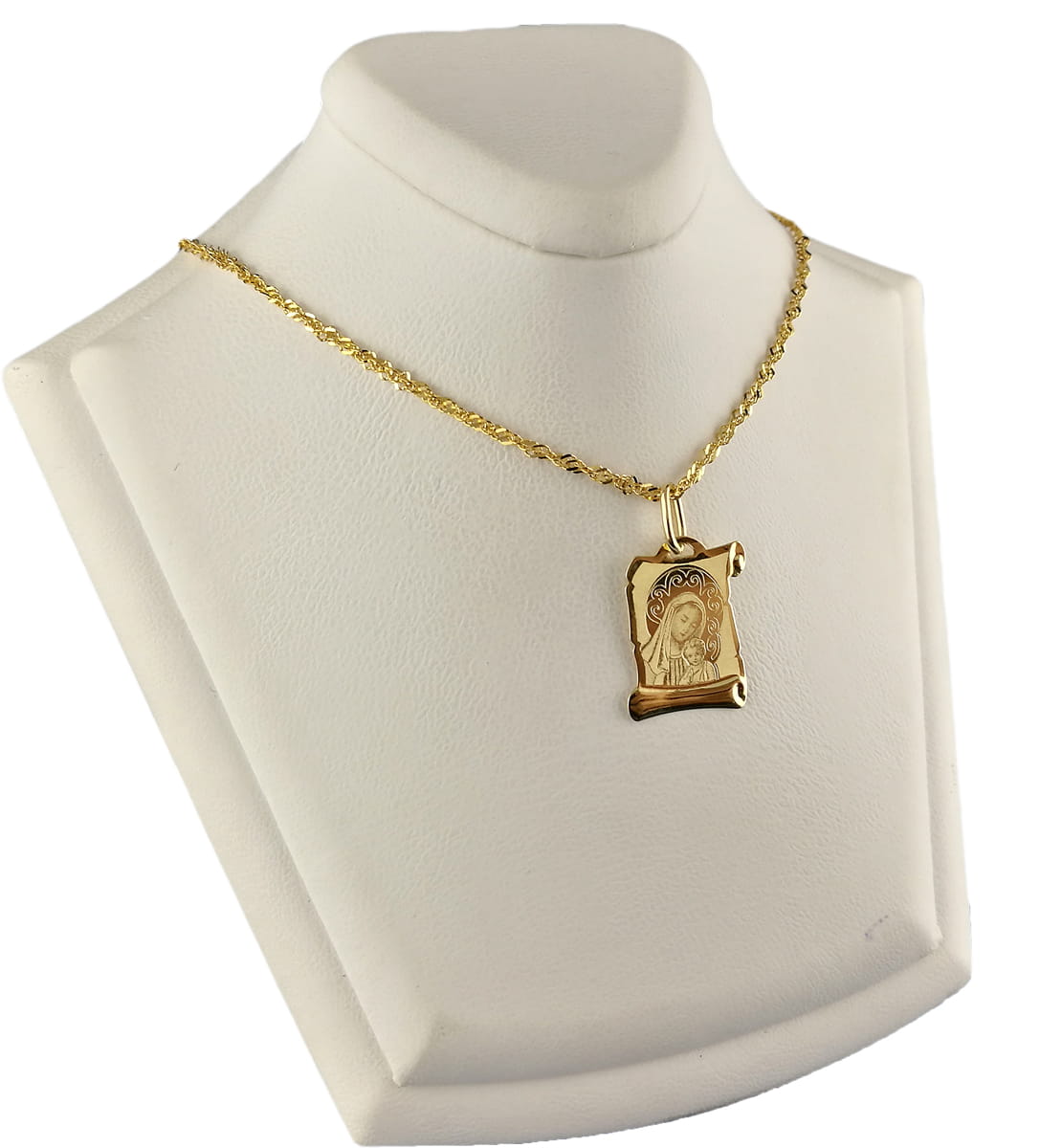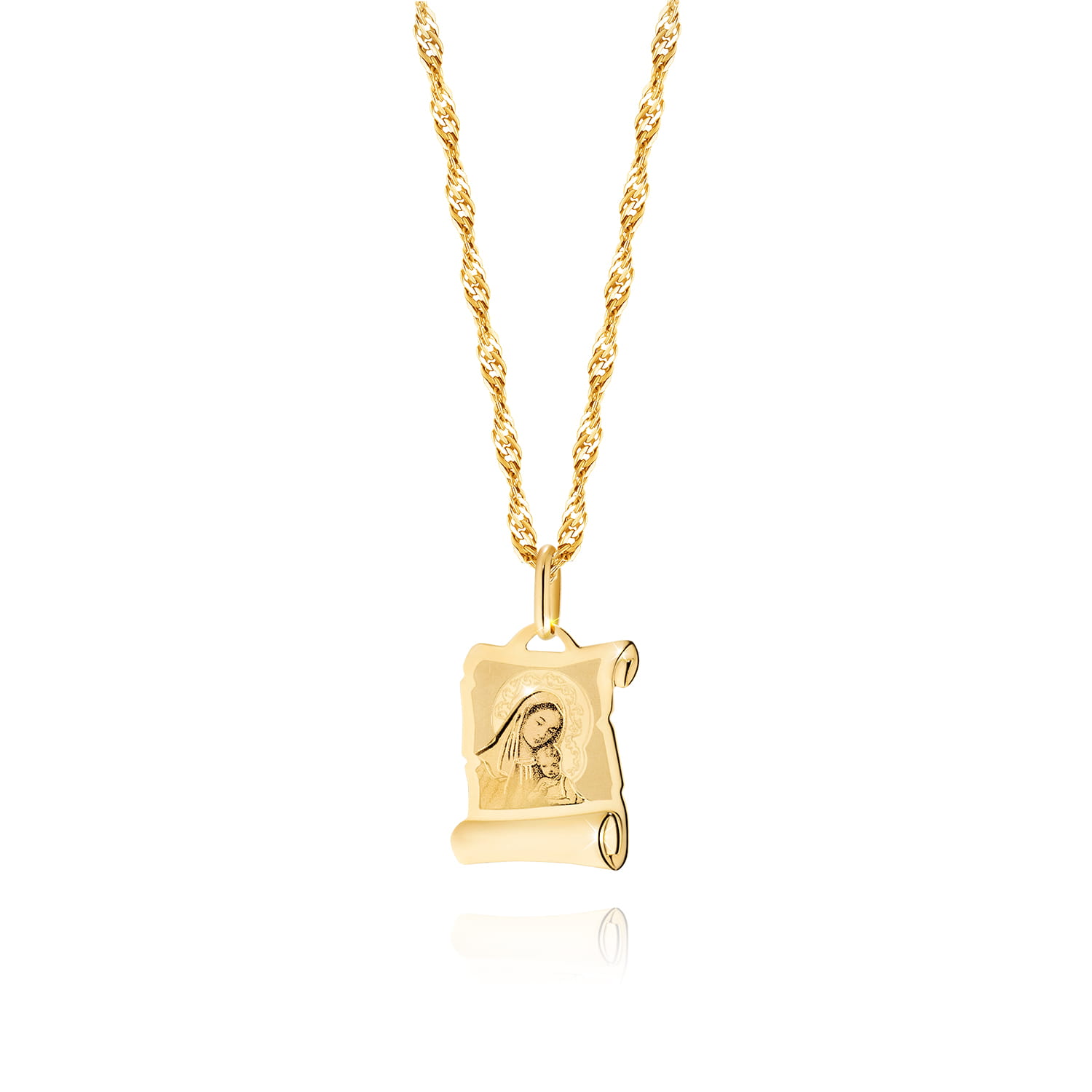 Przedmiotem sprzedaży jest złoty naszyjnik łańcuszek z medalikiem. Produkt jest nowy, zapakowany w eleganckie pudełeczko. Wyrób został precyzyjnie wykonany z należytą dbałością o detale.Łańcuszek posiada bezpieczne  zapięcie chroniące przed zgubieniem.Wszystko zostało wykonane ze złota próby 14 karatowej 585.Wszystkie złote wyroby oferowane w naszej sprzedaży posiadają nabitą próbę bądź znak imienny producenta potwierdzający autentyczność metalu szlachetnego. Każdy złoty produkt o masie powyżej 1 gram jest przebadany w Państwowym Urzędzie Probierczym pod kątem jakości złota i ma wybitą próbę zgodnie z Polskim prawem probierczym więc wybierając naszą ofertę masz 100% pewności że kupujesz wyrób oryginalny i faktycznie w całości wykonany ze złota.