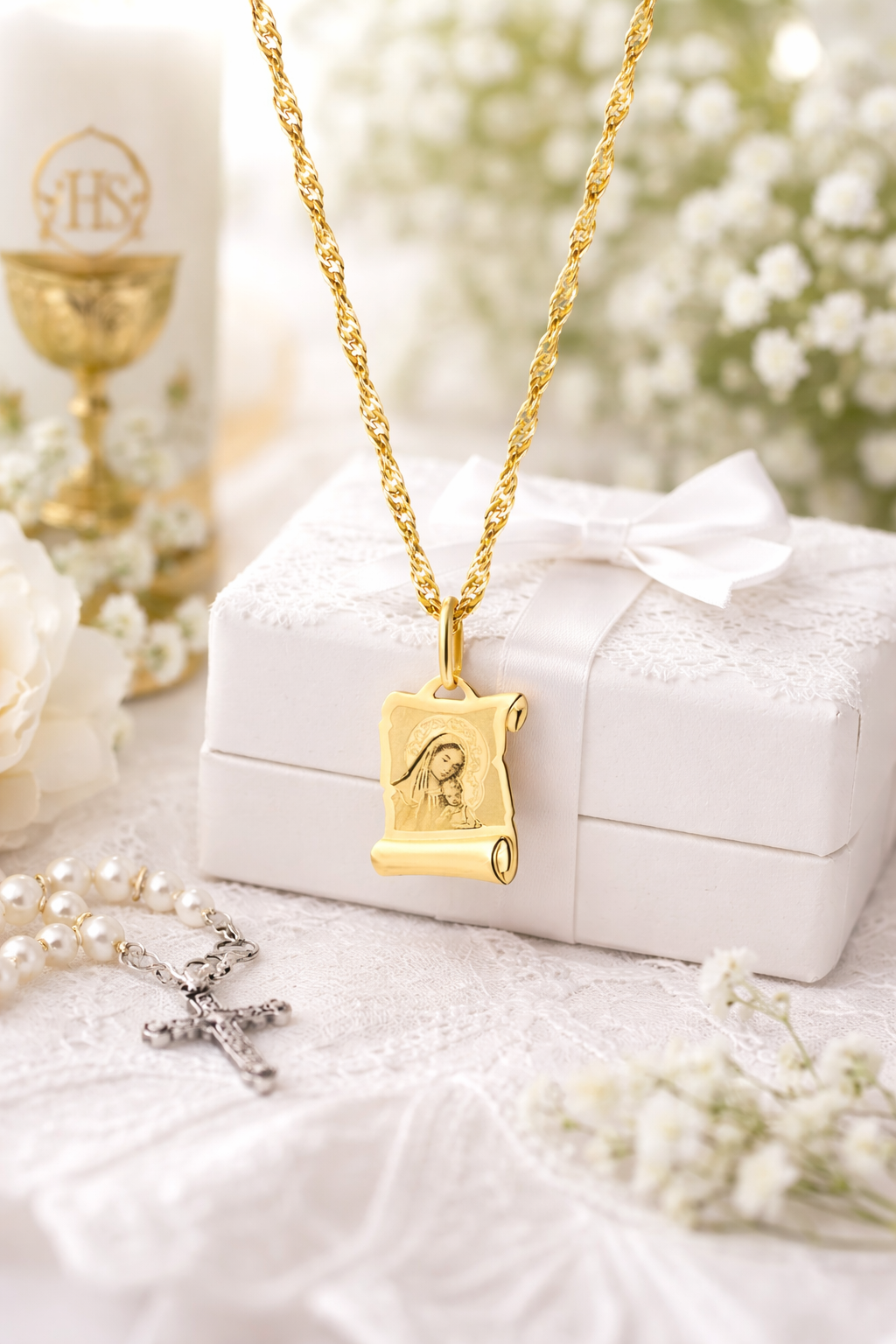 ➡️ Możesz wybrać w jakie pudełko zapakować produkt. Dostępne jest : standardowe brązowe z logiem firmy oraz okazjonalne do Komunii Św. lub Chrztu Św. w kolorze białym.