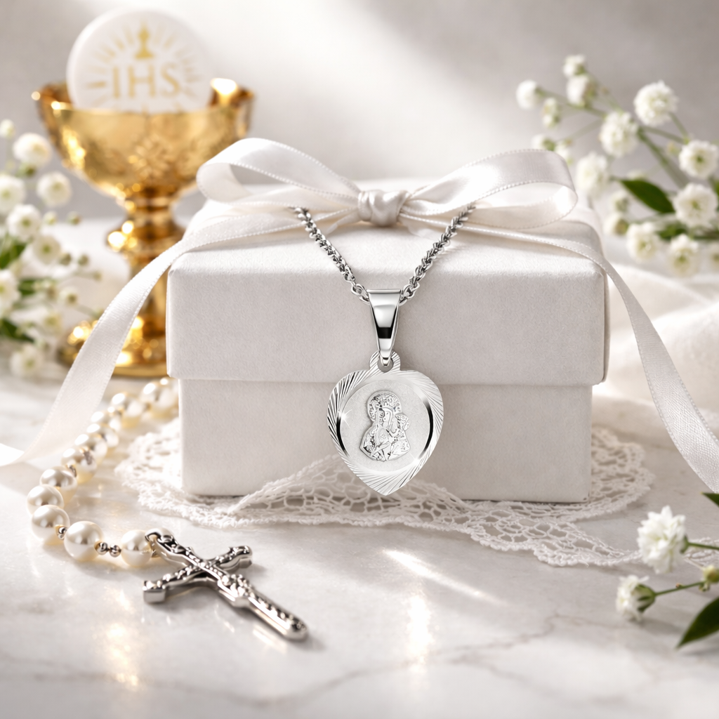 Podkreśl swoją wiarę i elegancję dzięki wyjątkowemu srebrnemu medalikowi z Matką Bożą z Dzieciątkiem.Piękny srebrny medalik w kształcie serca to wyjątkowy symbol wiary i miłości. Przedstawia wizerunek Matki Bożej z Dzieciątkiem, co czyni go doskonałym wyborem na pamiątkę religijną. Wykonany z najwyższej jakości srebra próby 925, łączy w sobie klasyczną formę z duchowym znaczeniem.