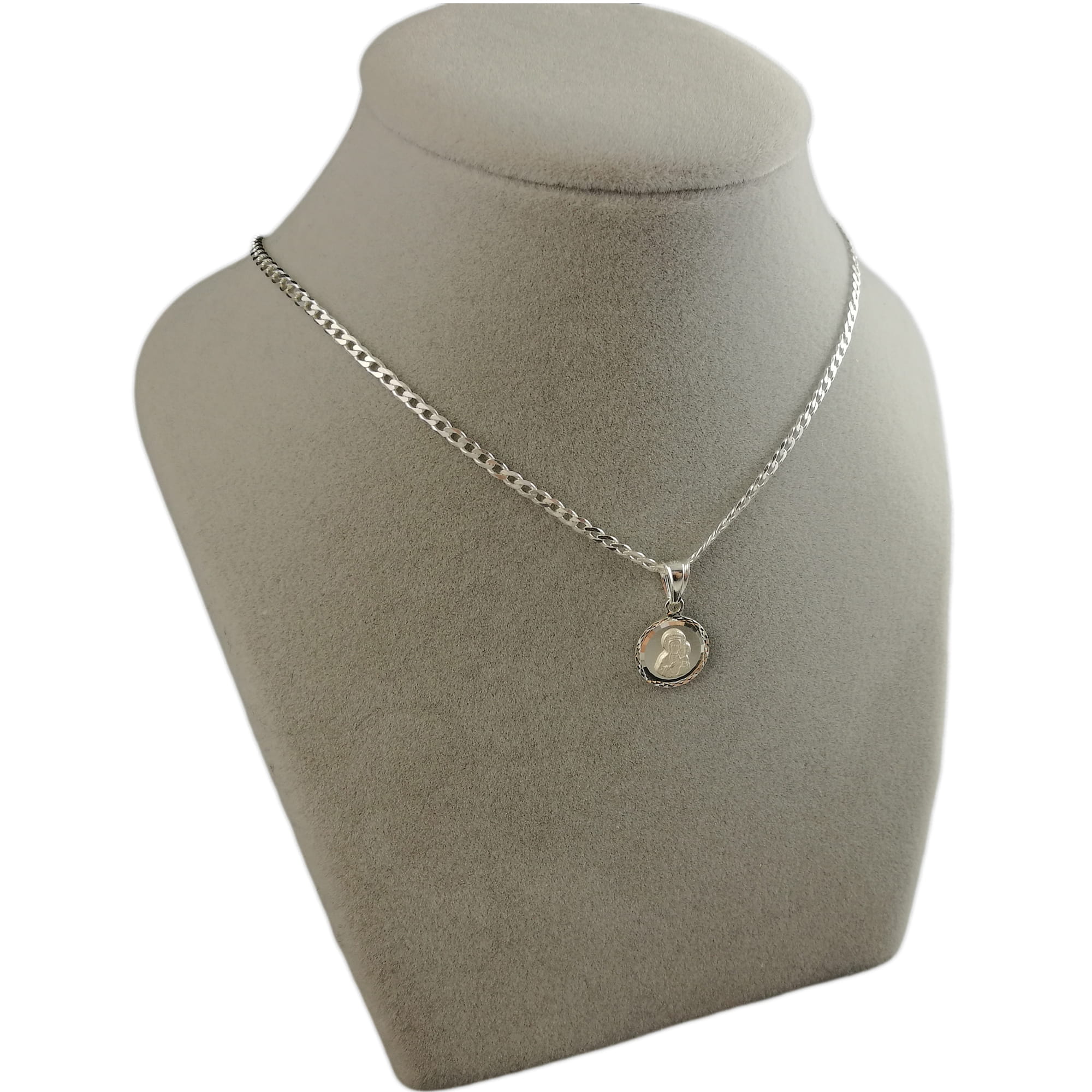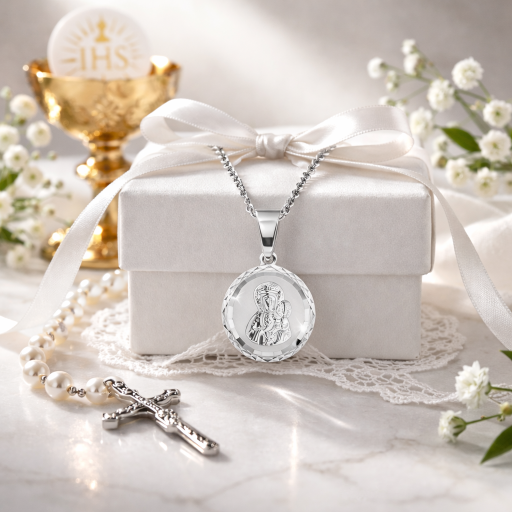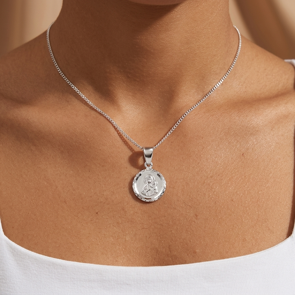 Podkreśl swoją wiarę i elegancję dzięki wyjątkowemu srebrnemu medalikowi z Matką Bożą z Dzieciątkiem. Stylowy i elegancki srebrny naszyjnik    z okrągłym medalikiem przedstawiającym wizerunek Matki Boskiej z diamentowanym brzegiem, odbijającym światło. Wykonany z najwyższej jakości srebra próby 925, łączy w sobie klasyczną formę z duchowym znaczeniem.