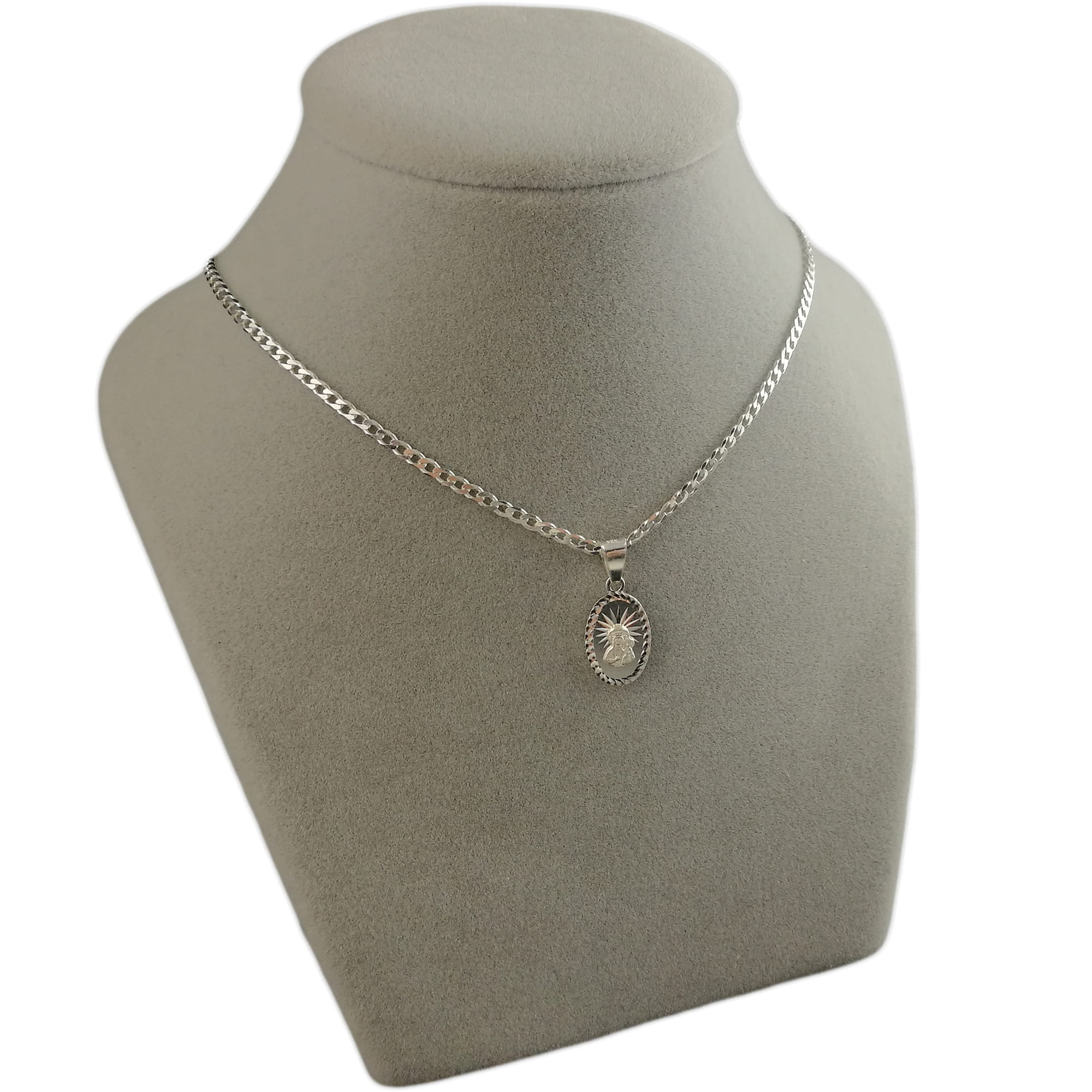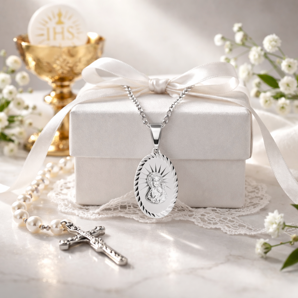 Wyjątkowy srebrny medalik w owalnym kształcie z pięknym wizerunkiem Matki Bożej z Dzieciątkiem. Klasyczny i ponadczasowy design sprawia, że jest to wyjątkowy symbol wiary, idealny na prezent religijny dla osób ceniących duchową symbolikę i klasyczną biżuterię. Precyzyjne zdobienia oraz połyskująca diamentowana powierzchnia sprawiają, że jest to wyjątkowy i ponadczasowy dodatek. Matka Boża z Dzieciątkiem – znak opieki i miłości.