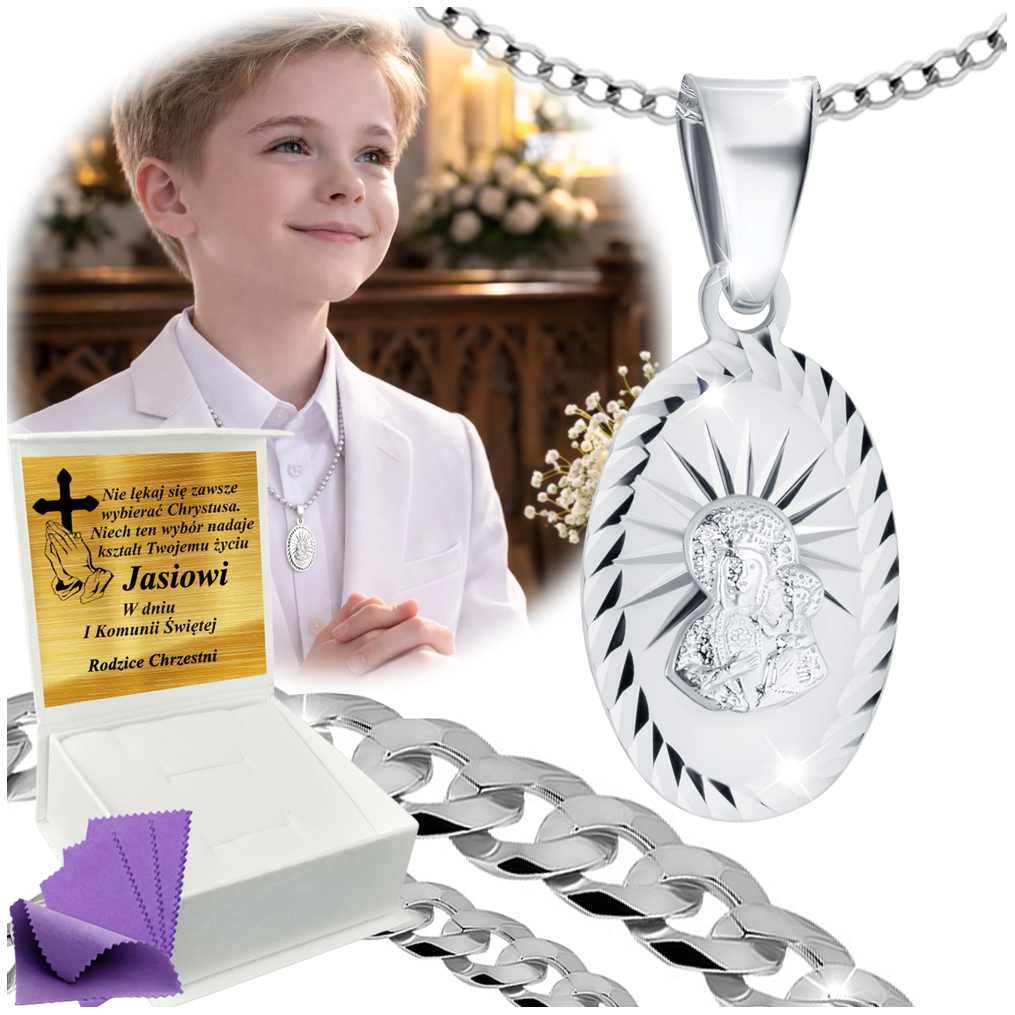 SREBRNY ŁAŃCUSZEK KOMUNIJNY Z MEDALIKIEM SREBRO 925 KOMUNIA CHRZEST GRAWER