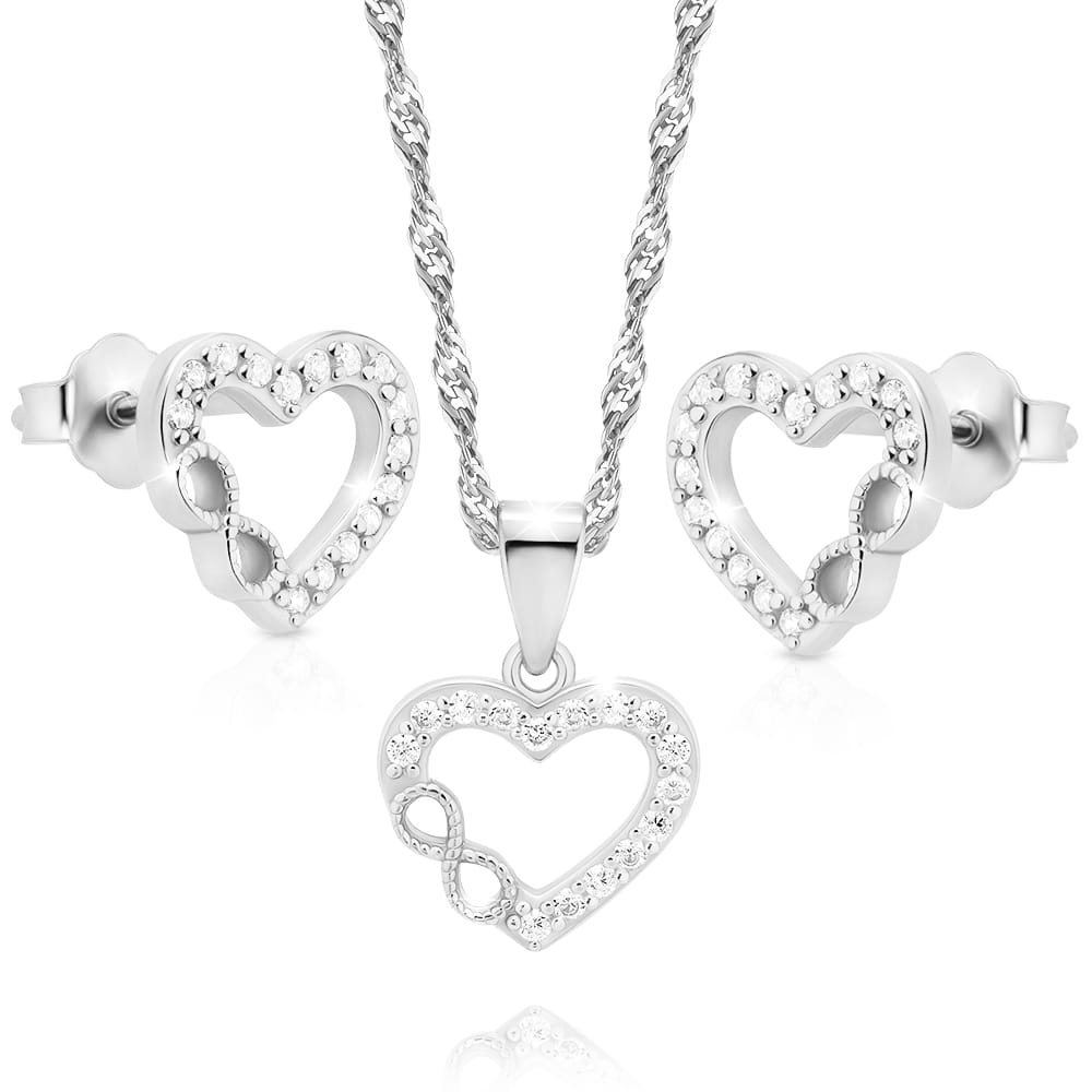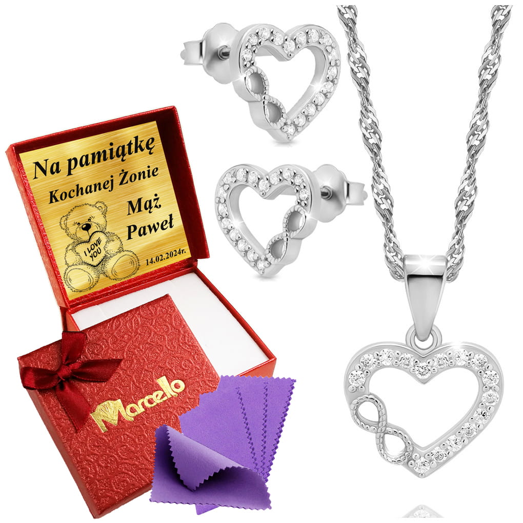 Komplet biżuterii Łańcuszek Kolczyki Wisiorek. W całości wykonany ze srebra próby 925. Zestaw biżuterii wysadzany przepięknymi cyrkoniami klasy AAA wspaniale odbijającymi światło wyglądającymi jak prawdziwe diamenty.