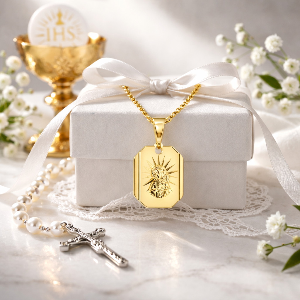 Elegancki i ponadczasowy złoty komplet składający się z medalika oraz łańcuszka to doskonały wybór na prezent religijny. Naszyjnik w całości wykonany z najwyższej jakości srebra próby 925 pokrytego podwójną warstwą 14 karatowego złota !!! Pięknie się mieni i odbija światło . Idealnie sprawdzi się na okazje takie jak Chrzest, Pierwsza Komunia Święta, Bierzmowanie czy urodziny.