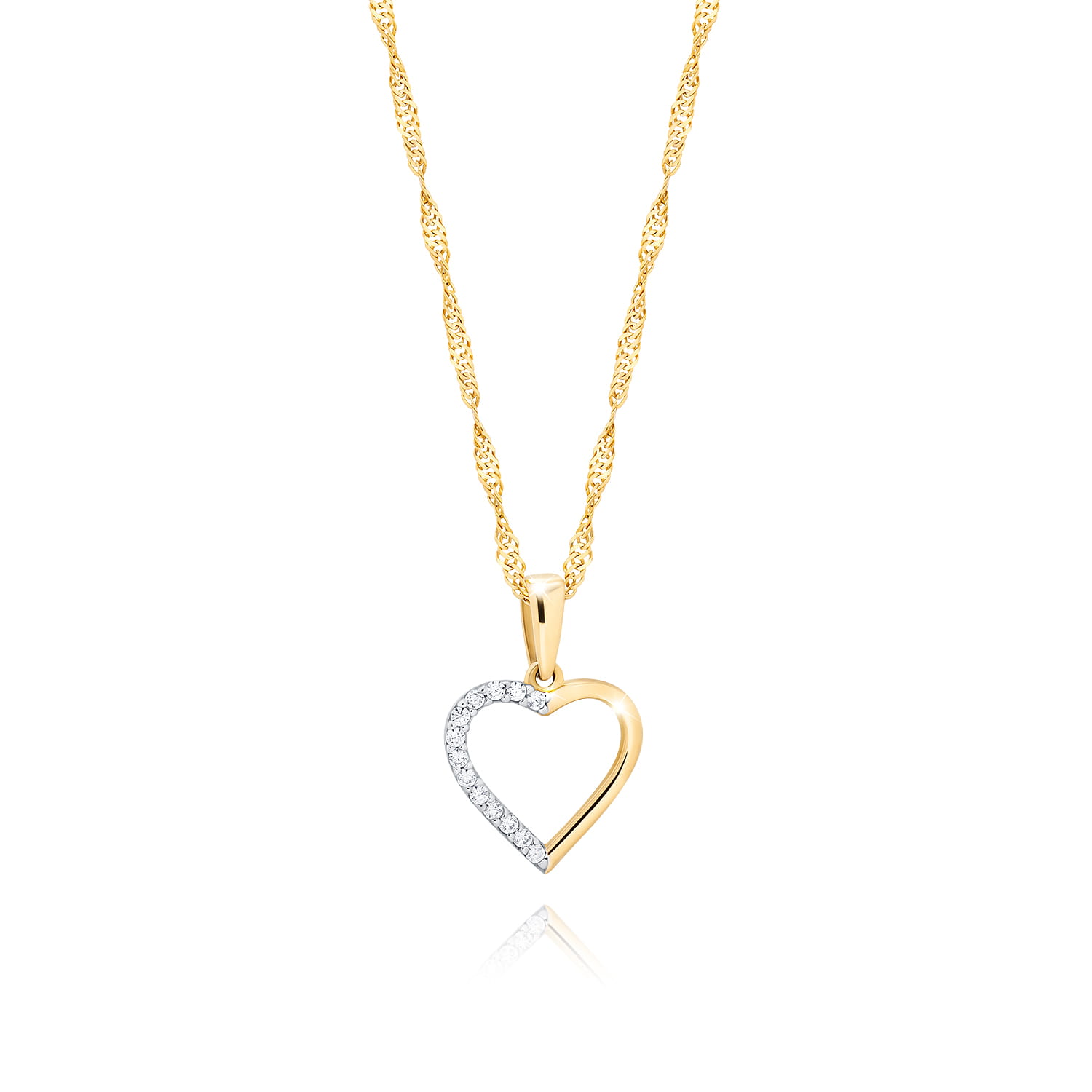 Podaruj bliskiej osobie wyjątkowy symbol miłości i elegancji. Ten piękny naszyjnik wykonany ze złota zachwyca swoją subtelnością i blaskiem. Zawieszka w kształcie serca, ozdobiona połyskującymi cyrkoniami, dodaje całości wyjątkowego uroku.