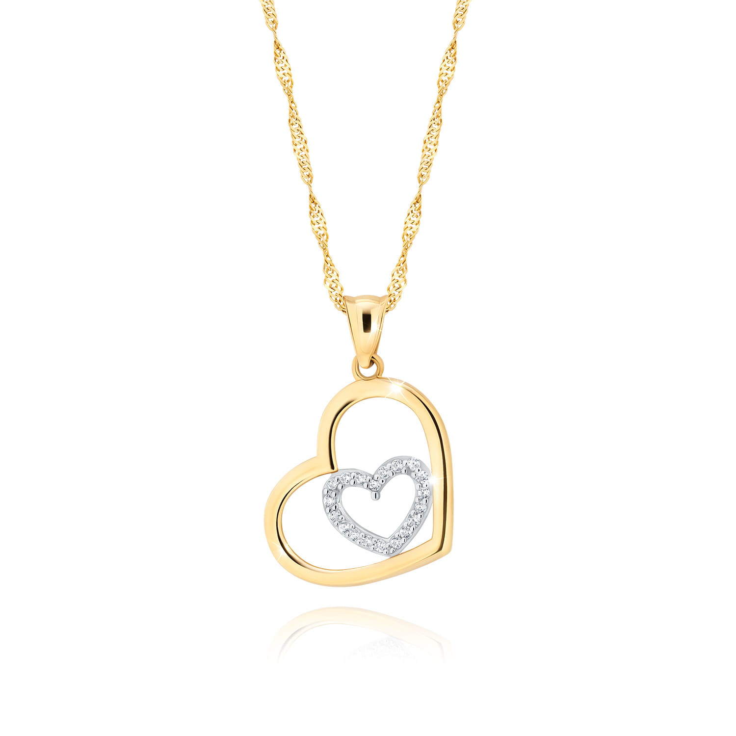Zachwycający naszyjnik w kształcie dwóch połączonych serc to doskonały wybór dla osoby, którą kochasz. Eleganckie połączenie złota i lśniących cyrkonii sprawia, że biżuteria ta emanuje subtelnym blaskiem i klasycznym wdziękiem.