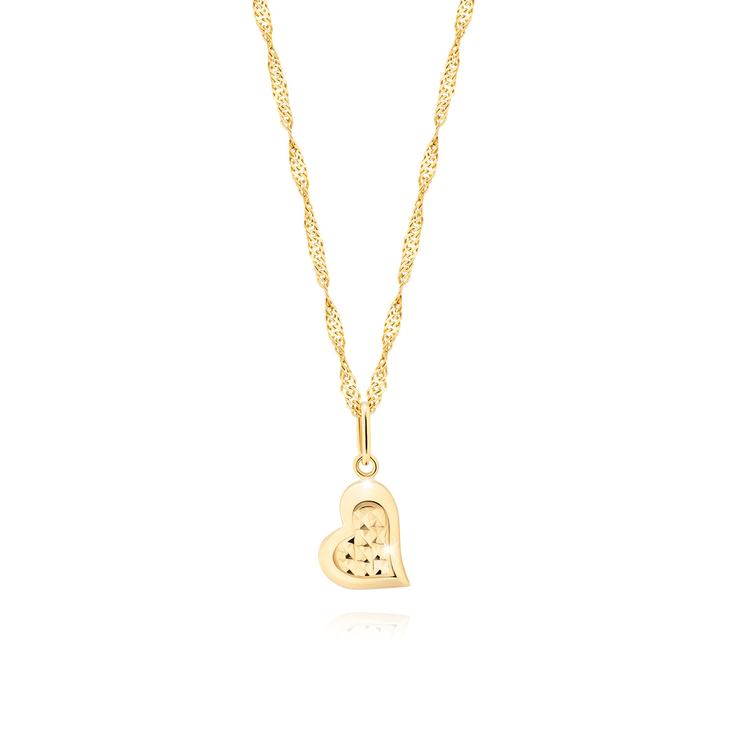 Podaruj bliskiej osobie wyjątkowy prezent pełen ciepła i uczucia! Ten elegancki naszyjnik z zawieszką w kształcie serca wykonany z wysokiej jakości złota to idealny sposób na wyrażenie miłości i wdzięczności. Subtelny wzór serca z pięknym, diamentowanym wykończeniem odbija światło, dodając mu blasku i niepowtarzalnego uroku.