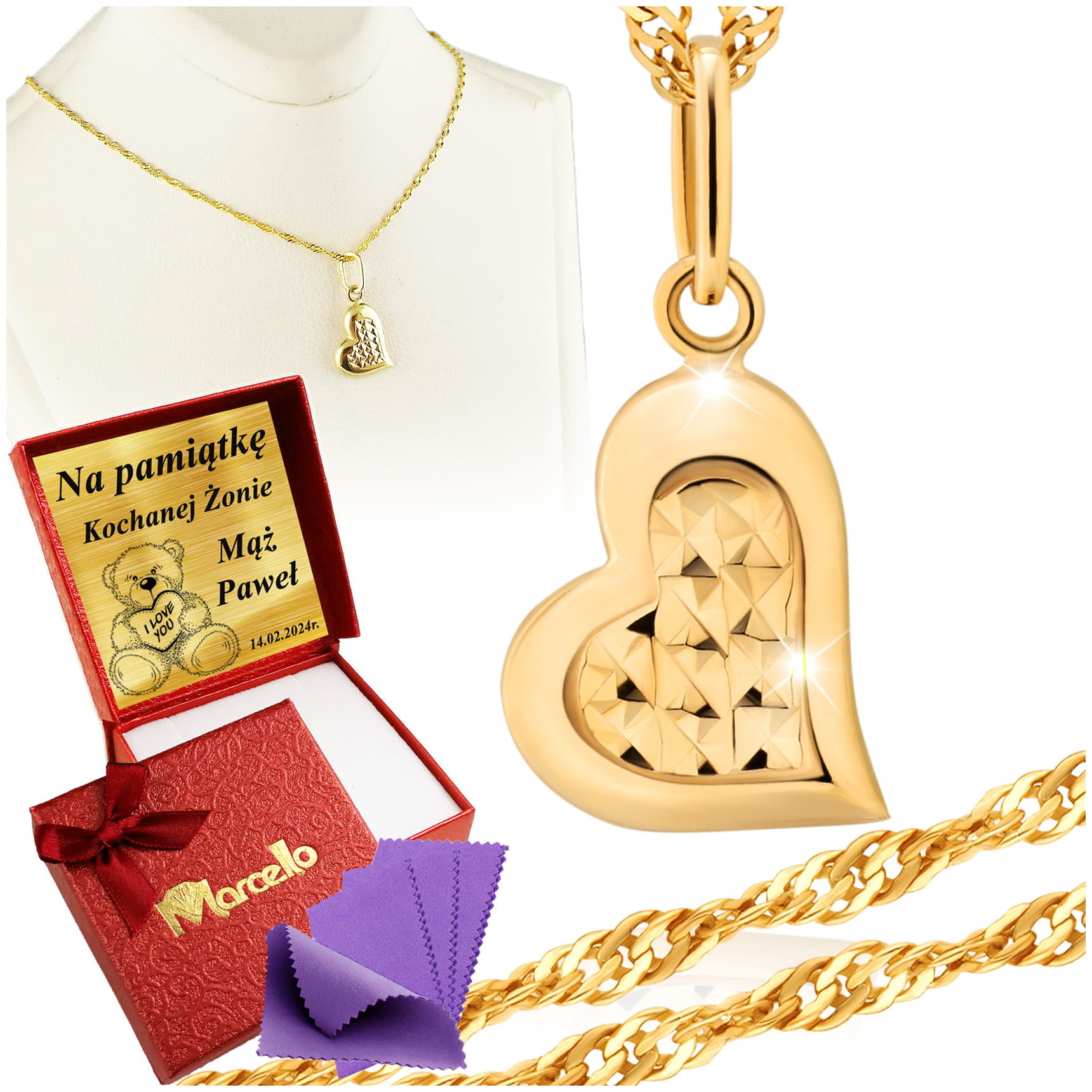 Złoty Łańcuszek 333 Naszyjnik Wisiorek Serce Grawer UPOMINEK GRATIS