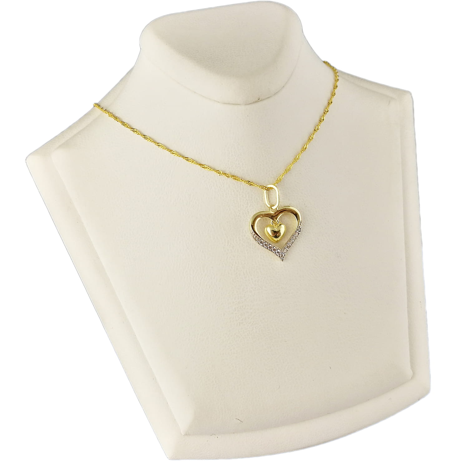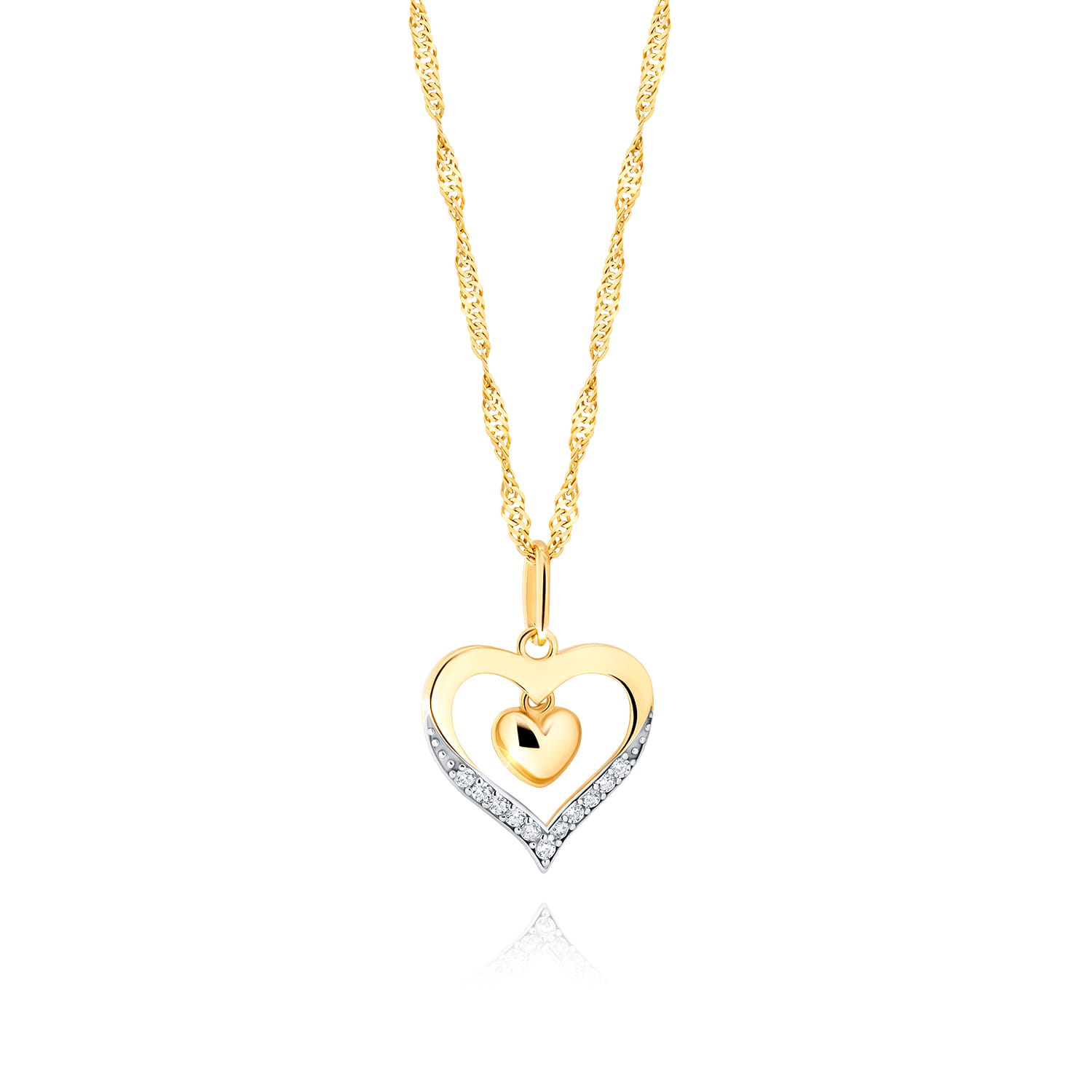 Podkreśl wyjątkowe uczucia i obdaruj bliską osobę pięknym naszyjnikiem w kształcie serca. Ta elegancka zawieszka łączy klasyczne złoto z połyskującymi cyrkoniami, a jej delikatne, mniejsze serce wewnątrz dodaje jej wyjątkowego uroku. To idealny wybór na prezent pełen miłości.
