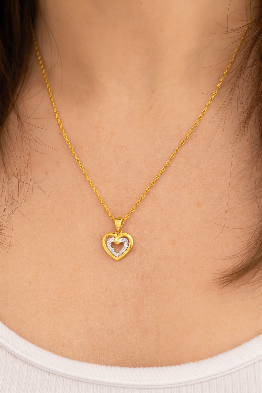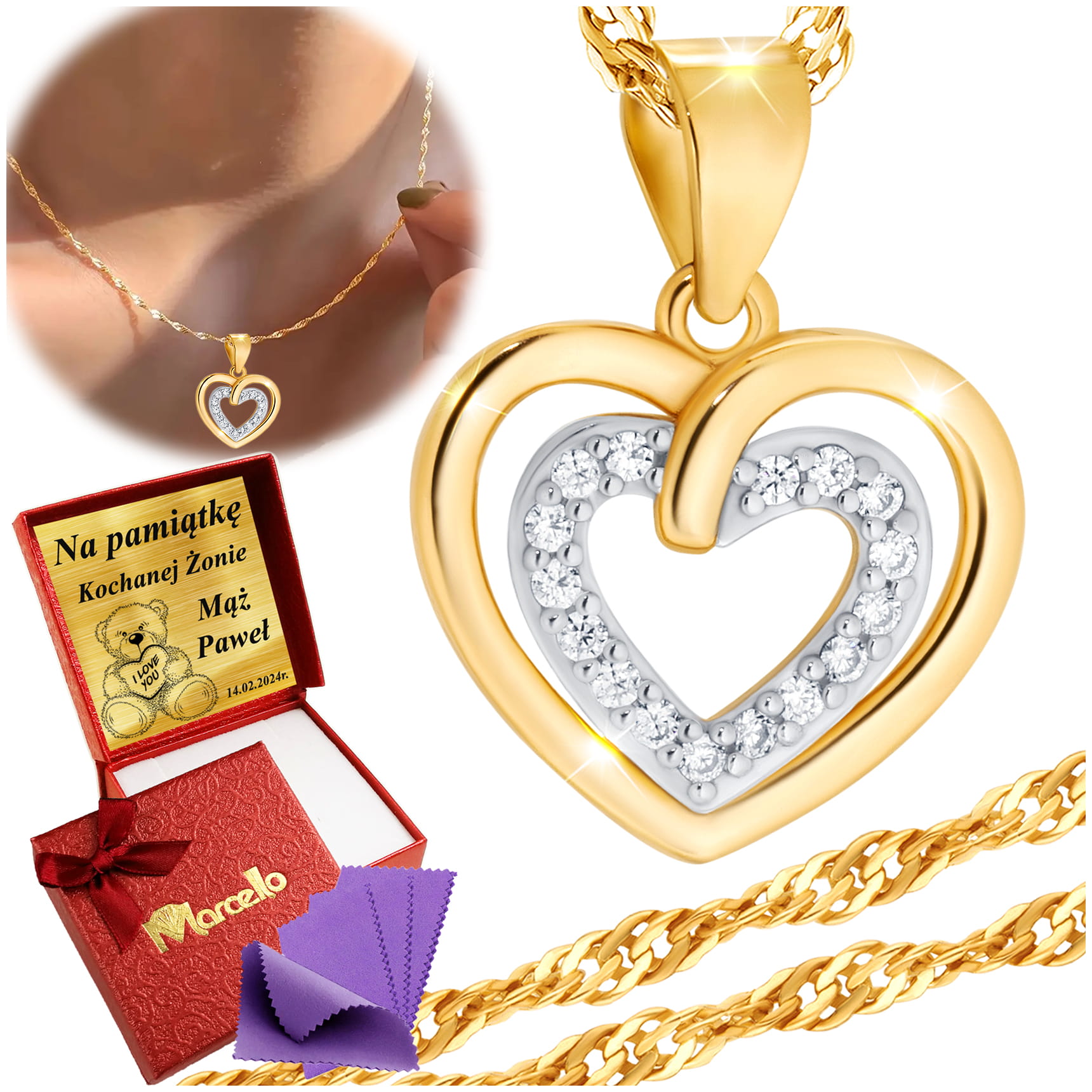 Podaruj wyjątkowy symbol miłości w postaci eleganckiego naszyjnika z podwójnym sercem. Ten piękny wisiorek łączy klasyczną złotą ramkę z delikatnym sercem wysadzanym lśniącymi cyrkoniami, które dodają mu blasku i wyjątkowego uroku. Jego subtelny, a zarazem efektowny design sprawia, że jest idealnym dodatkiem do każdej stylizacji.